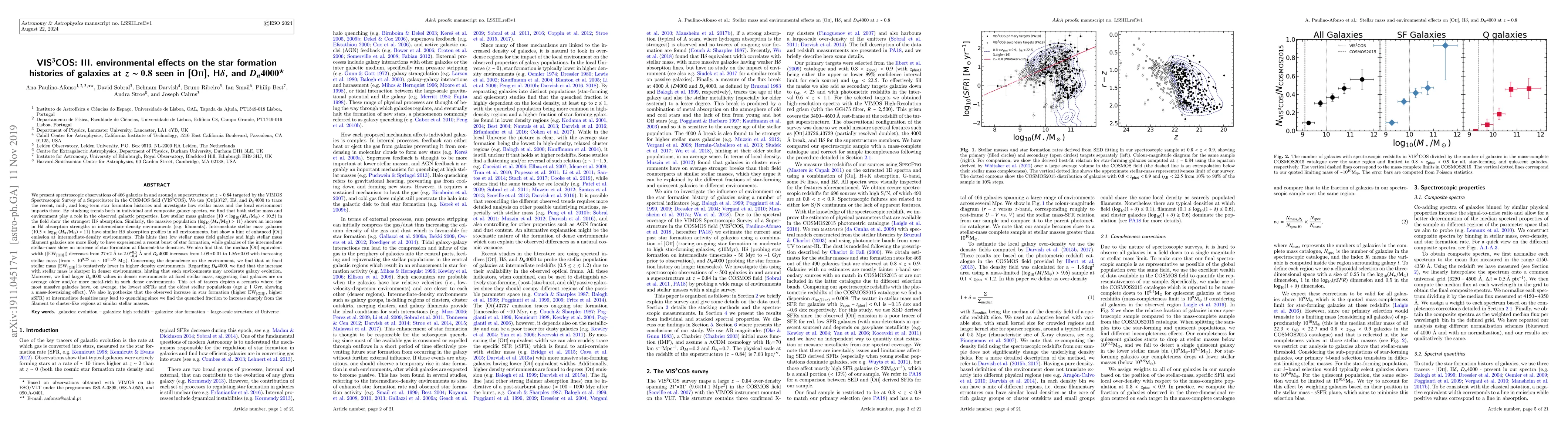 [ABRIDGED] We present spectroscopic observations of 466 galaxies in and around a superstructure at $z\sim0.84$ targeted by the VIMOS Spectroscopic Survey of a Supercluster in the COSMOS field (VIS$^{3}$COS). We use [OII]$\lambda$3727, H$\delta$, and $D_n4000$ to trace the recent, mid-, and long-term star formation histories and investigate how stellar mass and the local environment impacts those. By studying trends both in individual and composite galaxy spectra, we find that both stellar mass and environment play a role in the observed galactic properties. We find that the median [OII] equivalent width (|EW$_\mathrm{[OII]}|$) decreases from $27\pm2$ {\AA} to $2.0_{-0.4}^{+0.5}$ {\AA} and $D_n4000$ increases from $1.09\pm0.01$ to $1.56\pm0.03$ with increasing stellar mass (from $\sim10^{9.25}$ to $\sim10^{11.35}\ \mathrm{M_\odot}$). Concerning the dependence on the environment, we find that at fixed stellar mass |EW$_\mathrm{[OII]}|$ is tentatively lower in higher density environments. Regarding $D_n4000$, we find that the increase with stellar mass is sharper in denser environments, hinting that such environments may accelerate galaxy evolution. Moreover, we find larger $D_n4000$ values in denser environments at fixed stellar mass, suggesting that galaxies are on average older and/or more metal-rich in such dense environments. This set of tracers depicts a scenario where the most massive galaxies have, on average, the lowest sSFRs and the oldest stellar populations (age $\gtrsim1$ Gyr, showing a mass-downsizing effect). We also hypothesize that the observed increase in star formation (higher EW$_\mathrm{[OII]|}$, higher sSFR) at intermediate densities may lead to quenching since we find the quenched fraction to increase sharply from the filament to cluster-like regions at similar stellar masses.