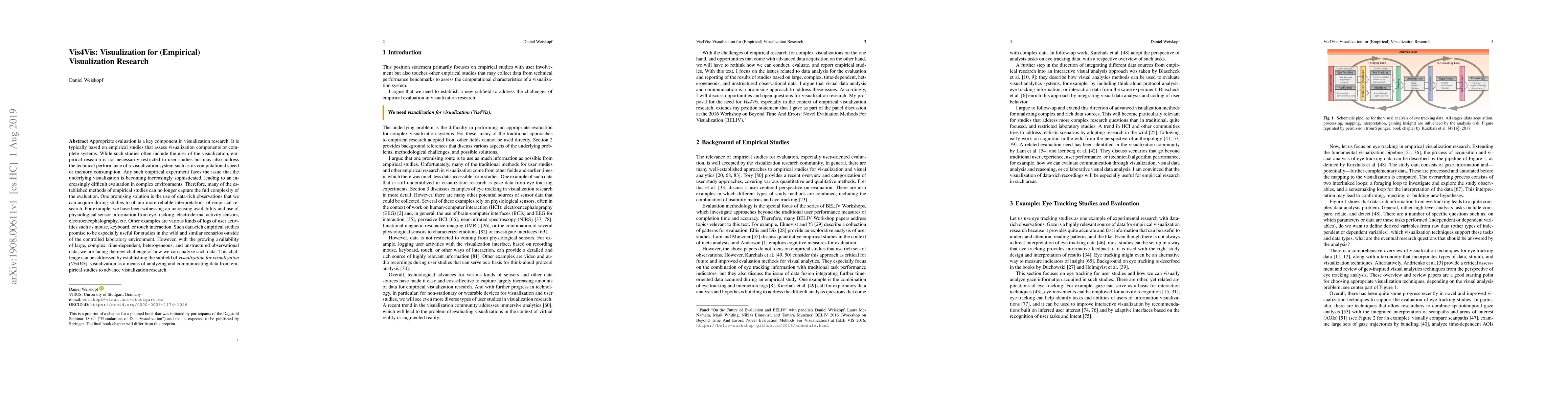 The paper discusses the importance of appropriate evaluation in visualization research, highlighting the challenges posed by increasingly sophisticated visualizations. It proposes the subfield of "visualization for visualization" (Vis4Vis) to analyze complex, large, and heterogeneous observational data from empirical studies, thereby enhancing the reliability and interpretation of visualization research.