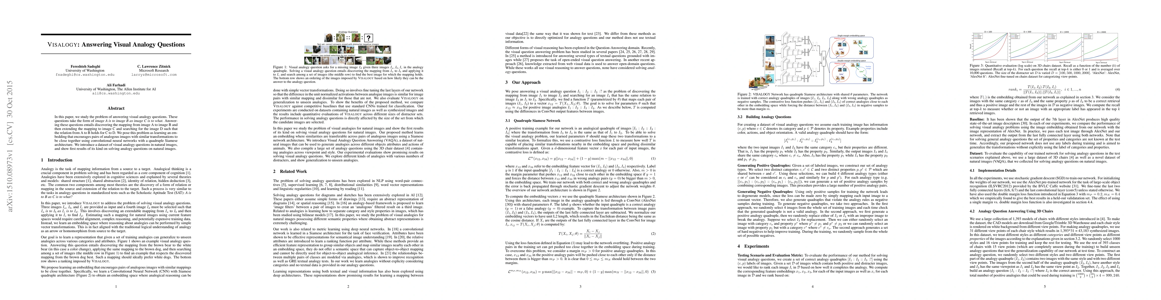 This paper explores the challenge of answering visual analogy questions using convolutional neural networks with a quadruple Siamese architecture to learn image embeddings that map analogous images. The authors introduce a new dataset for visual analogy questions and demonstrate initial results on solving such questions in natural images.