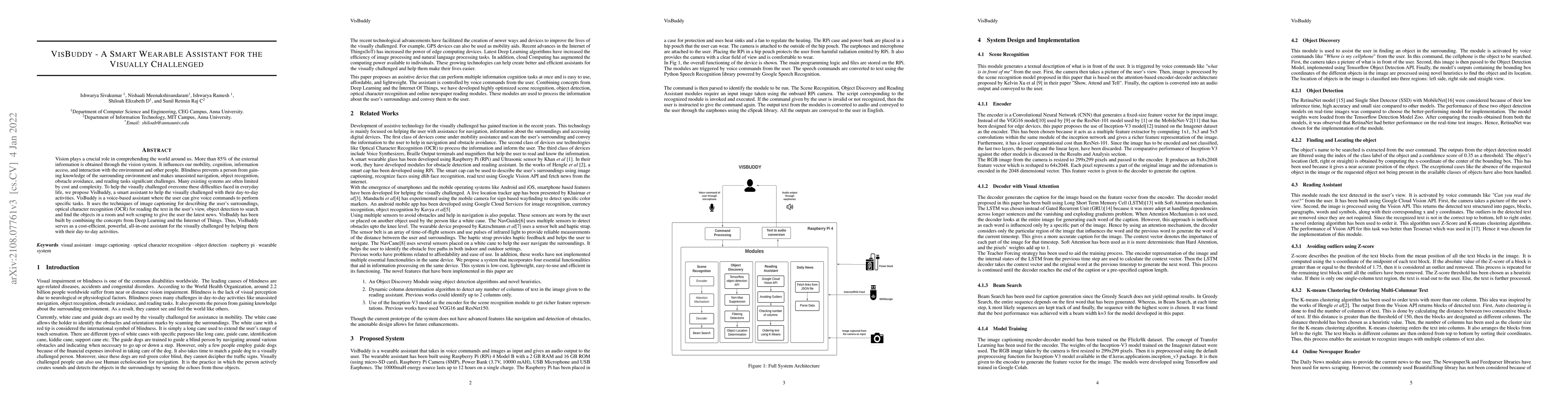 VisBuddy is a smart wearable assistant designed to aid the visually challenged by providing voice-based support for daily tasks, utilizing image captioning, OCR, object detection, and web scraping. It combines deep learning and IoT for cost-effective, comprehensive assistance.