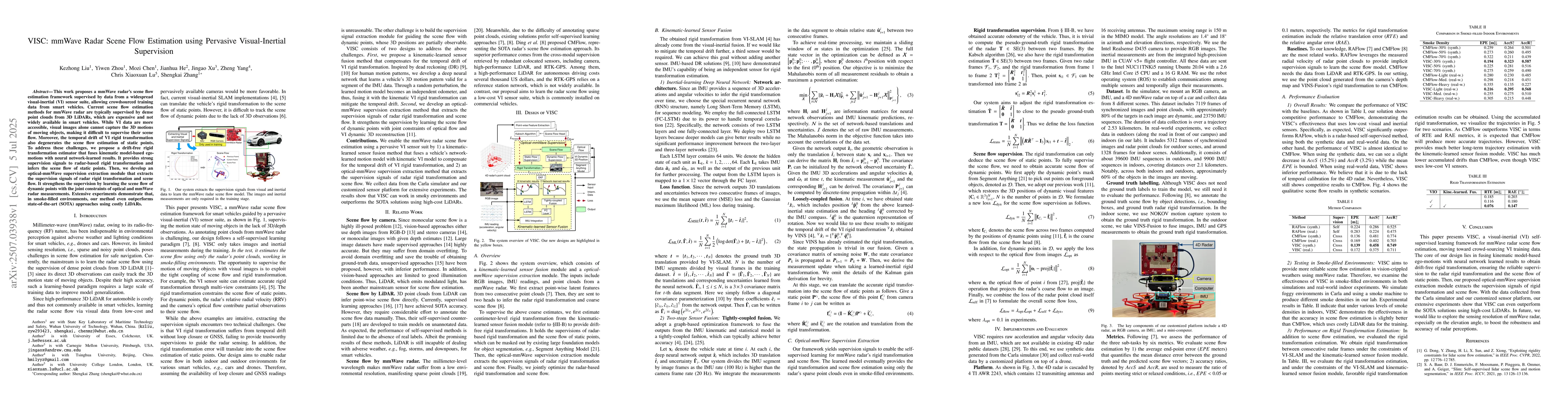 The paper proposes VISC, a self-supervised learning framework for mmWave radar scene flow estimation using pervasive visual-inertial (VI) supervision. It addresses the challenge of using VI data for supervision, which is more accessible than expensive 3D LiDARs, by proposing a drift-free rigid transformation estimator that fuses kinematic model-based ego-motions with neural network-learned results.
