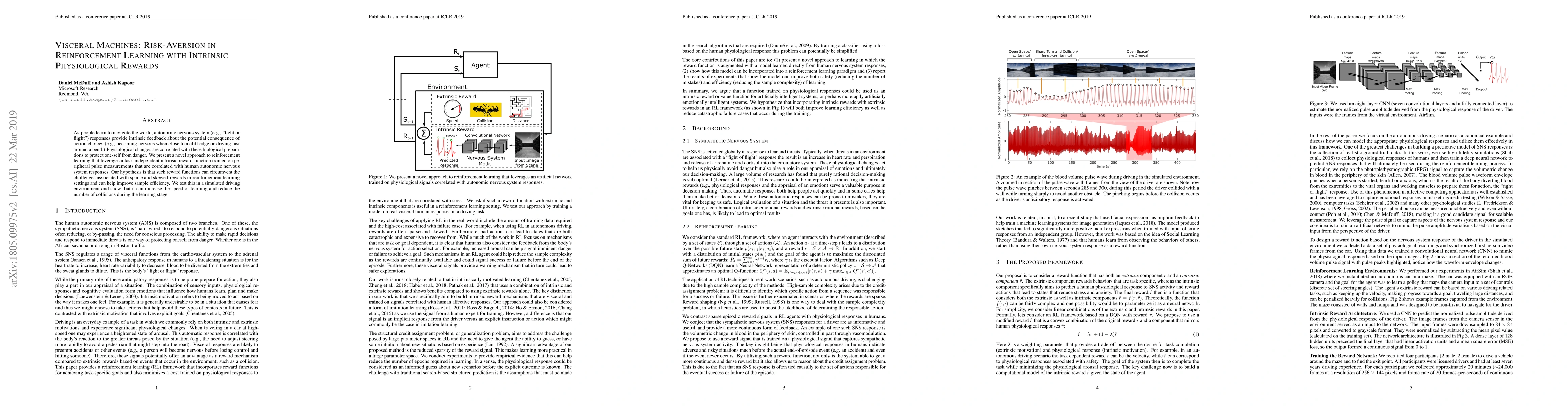 As people learn to navigate the world, autonomic nervous system (e.g., "fight or flight") responses provide intrinsic feedback about the potential consequence of action choices (e.g., becoming nervous when close to a cliff edge or driving fast around a bend.) Physiological changes are correlated with these biological preparations to protect one-self from danger. We present a novel approach to reinforcement learning that leverages a task-independent intrinsic reward function trained on peripheral pulse measurements that are correlated with human autonomic nervous system responses. Our hypothesis is that such reward functions can circumvent the challenges associated with sparse and skewed rewards in reinforcement learning settings and can help improve sample efficiency. We test this in a simulated driving environment and show that it can increase the speed of learning and reduce the number of collisions during the learning stage.
