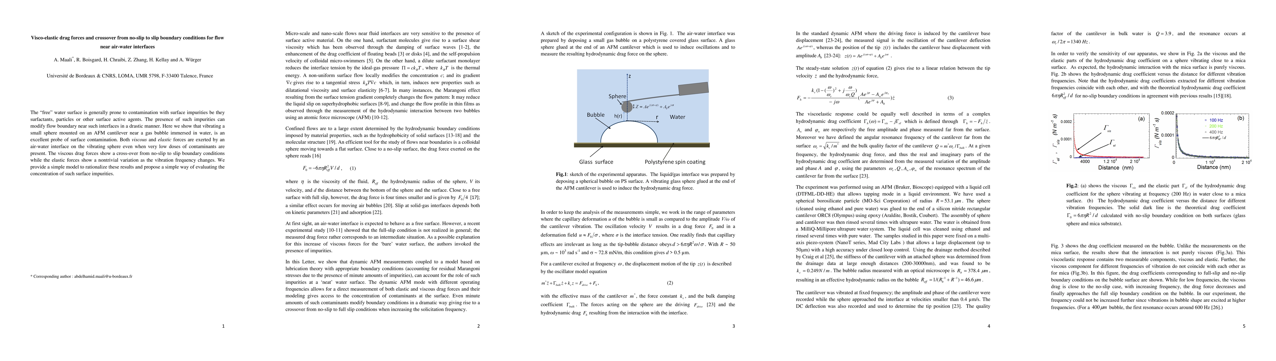 The paper presents a detailed analysis of visco-elastic drag forces near air-water interfaces, providing a model and calculations to understand the transition from no-slip to slip boundary conditions due to surface impurities.