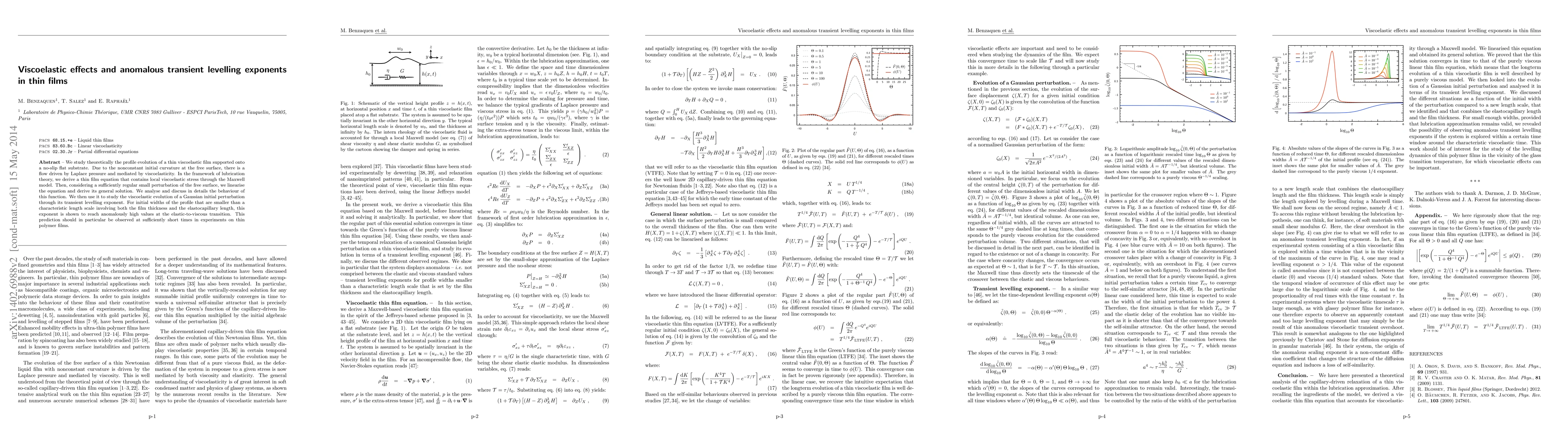 We study theoretically the profile evolution of a thin viscoelastic film supported onto a no-slip flat substrate. Due to the nonconstant initial curvature at the free surface, there is a flow driven by Laplace pressure and mediated by viscoelasticity. In the framework of lubrication theory, we derive a thin film equation that contains local viscoelastic stress through the Maxwell model. Then, considering a sufficiently regular small perturbation of the free surface, we linearise the equation and derive its general solution. We analyse and discuss in details the behaviour of this function. We then use it to study the viscoelastic evolution of a Gaussian initial perturbation through its transient levelling exponent. For initial widths of the profile that are smaller than a characteristic length scale involving both the film thickness and the elastocapillary length, this exponent is shown to reach anomalously high values at the elastic-to-viscous transition. This prediction should in particular be observed at sufficiently short times in experiments on thin polymer films.