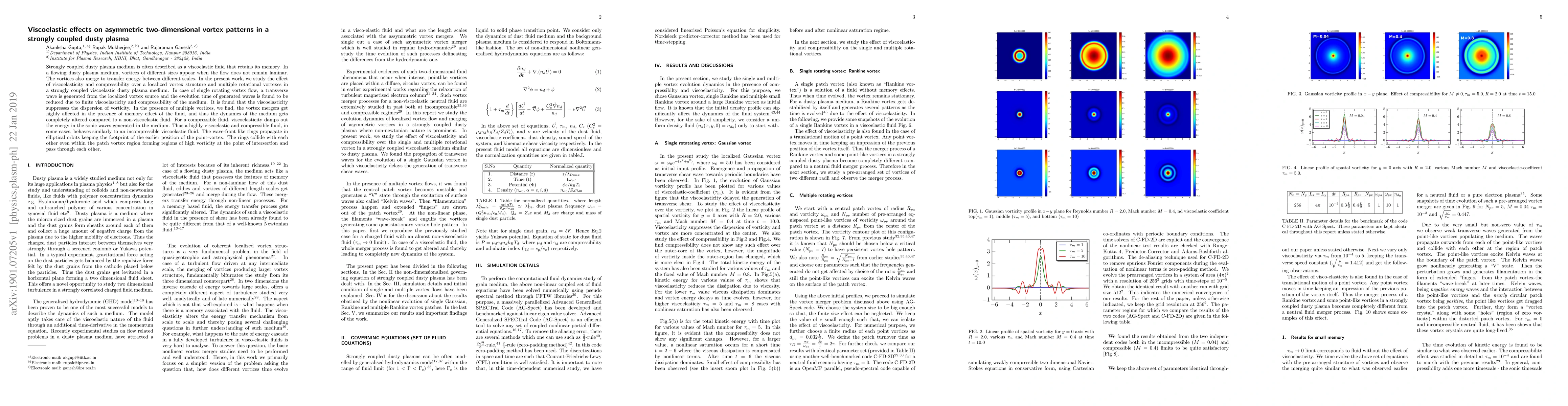 This study investigates the viscoelastic effects on asymmetric vortex patterns in a strongly coupled dusty plasma medium, revealing that viscoelasticity suppresses vorticity dispersion and alters vortex merger dynamics. The presence of viscoelasticity and compressibility reduces wave evolution time and dampens sonic wave energy, leading to complex interactions between vortex rings.