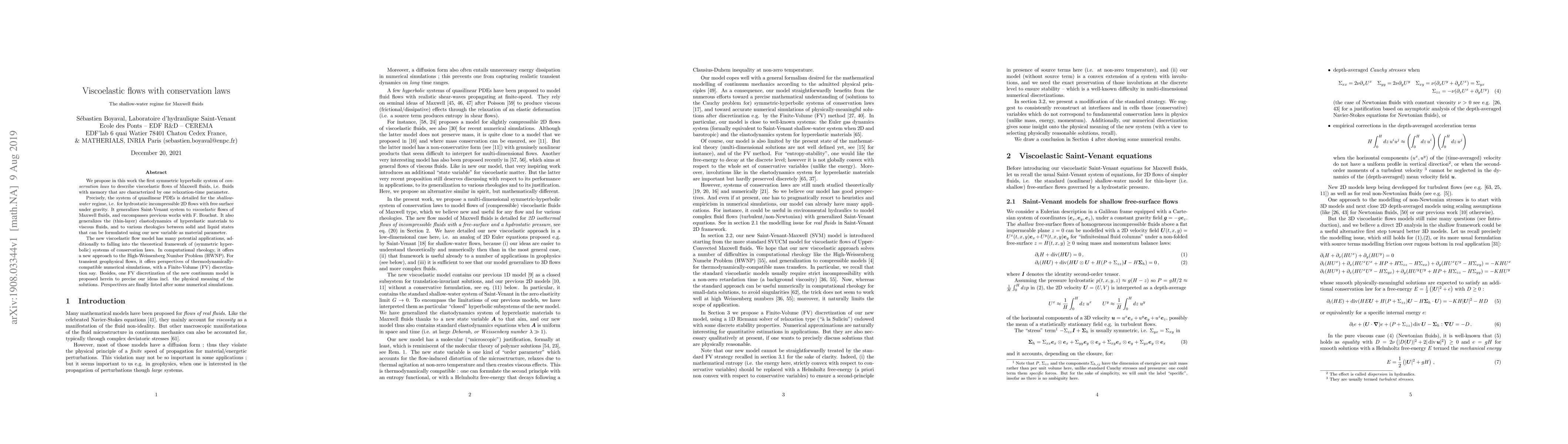 This paper introduces a novel symmetric hyperbolic system of conservation laws to model viscoelastic flows of Maxwell fluids, particularly focusing on the shallow-water regime. The new model generalizes existing equations and offers computational approaches for the High-Weissenberg Number Problem in rheology and thermodynamically-compatible simulations for geophysical flows.