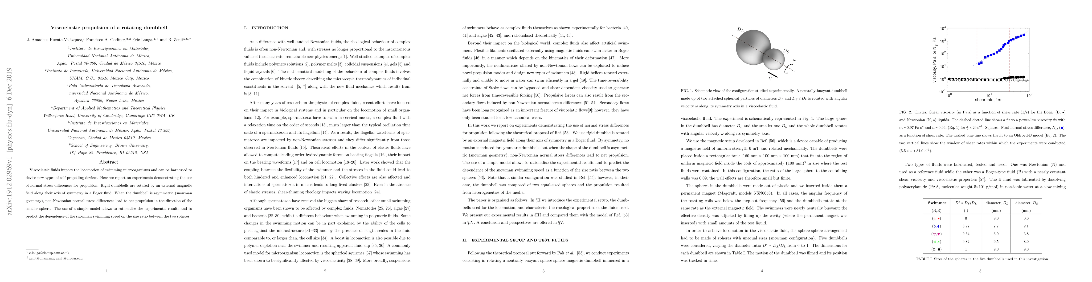 This paper investigates the propulsion of a rotating dumbbell in viscoelastic fluids, demonstrating that normal stress differences enable net movement in the direction of the smaller sphere. Experimental results with a snowman-shaped dumbbell in a Boger fluid are rationalized using a simple model to predict the speed based on the size ratio of the spheres.