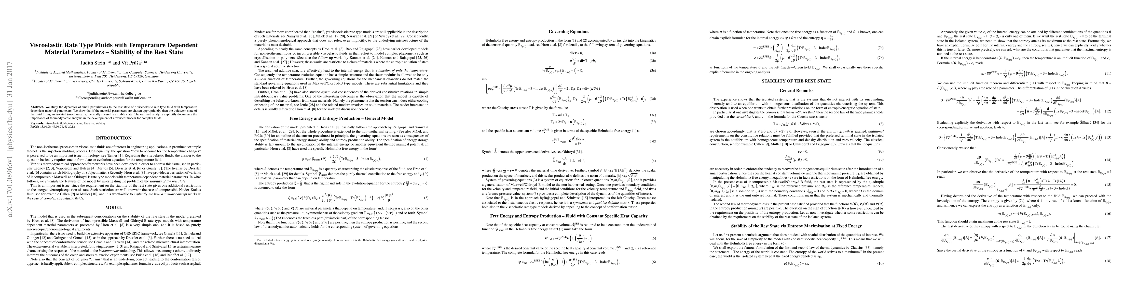 We study the dynamics of small perturbations to the rest state of a viscoelastic rate type fluid with temperature dependent material parameters. We show that if the material parameters are chosen appropriately, then the quiescent state of the fluid filling an isolated (mechanically, thermally) vessel is a stable state. The outlined analysis explicitly documents the importance of thermodynamic analysis in the development of advanced models for complex fluids.