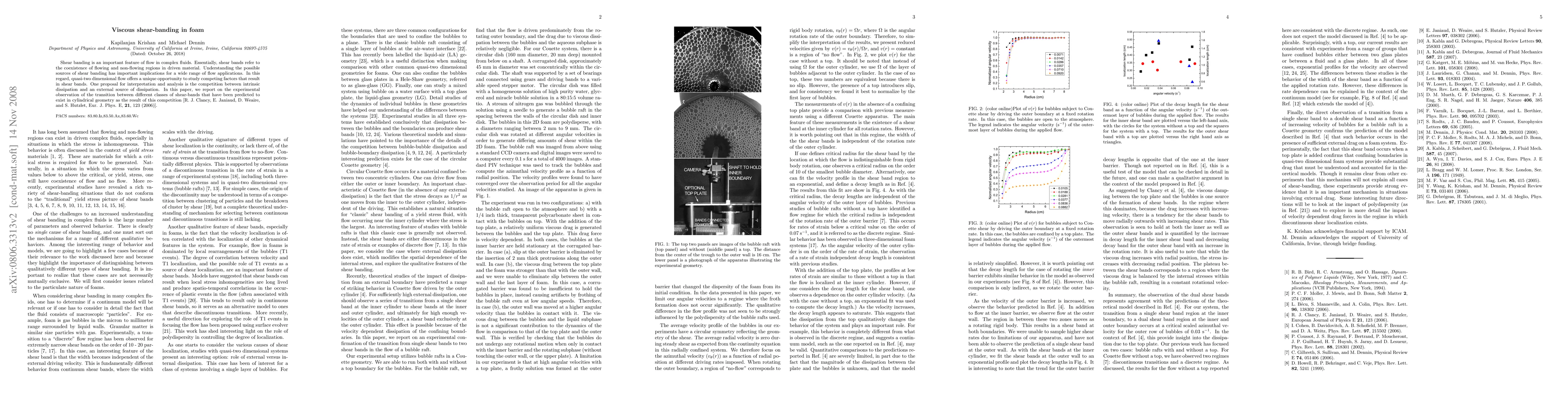 Shear banding is an important feature of flow in complex fluids. Essentially, shear bands refer to the coexistence of flowing and non-flowing regions in driven material. Understanding the possible sources of shear banding has important implications for a wide range of flow applications. In this regard, quasi-two dimensional flow offers a unique opportunity to study competing factors that result in shear bands. One proposal is the competition between intrinsic dissipation and an external source of dissipation. In this paper, we report on the experimental observation of the transition between different classes of shear-bands that have been predicted to exist in cylindrical geometry as the result of this competition [R. J. Clancy, E. Janiaud, D. Weaire, and S. Hutzlet, Eur. J. Phys. E, {\bf 21}, 123 (2006)].