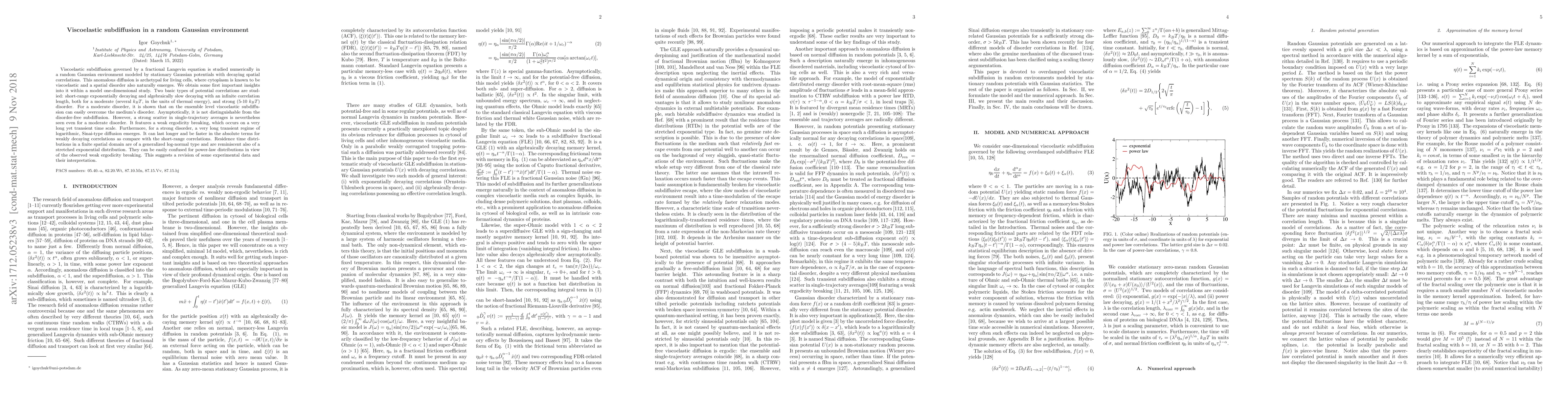 This paper numerically investigates viscoelastic subdiffusion in a random Gaussian environment, showing that moderate disorder does not significantly impede subdiffusion, while strong disorder leads to a transient logarithmic diffusion regime. The study highlights weak ergodicity breaking and suggests potential revisions in interpreting experimental data.