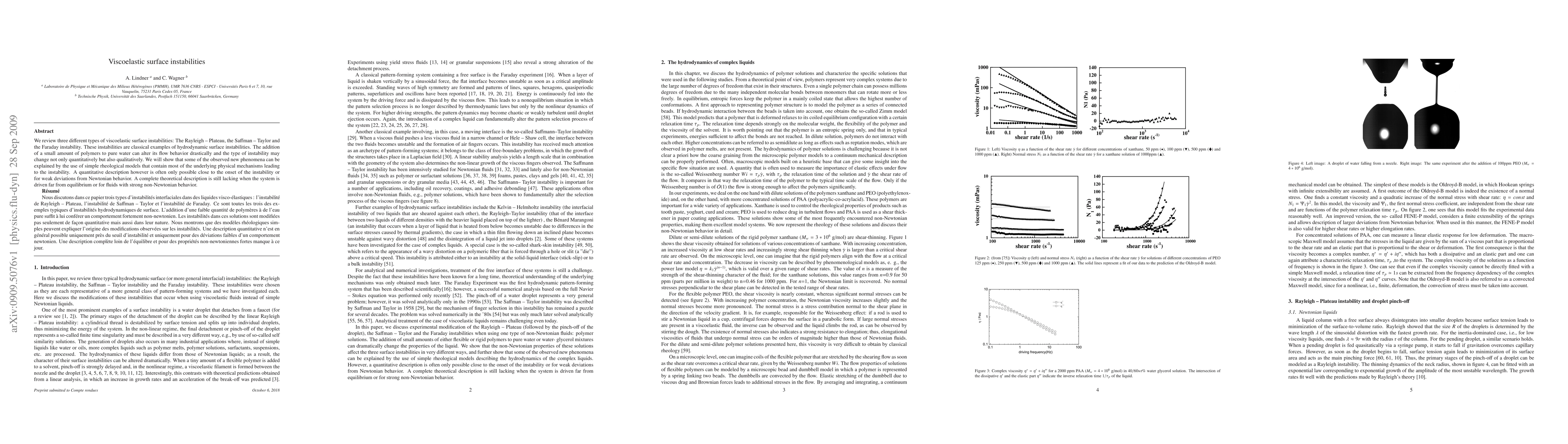This paper reviews three types of viscoelastic surface instabilities—Rayleigh-Plateau, Saffman-Taylor, and Faraday—highlighting how polymer addition alters water's flow behavior. Simple rheological models explain some phenomena, but a comprehensive theoretical description is lacking for systems far from equilibrium or with strong non-Newtonian behavior.