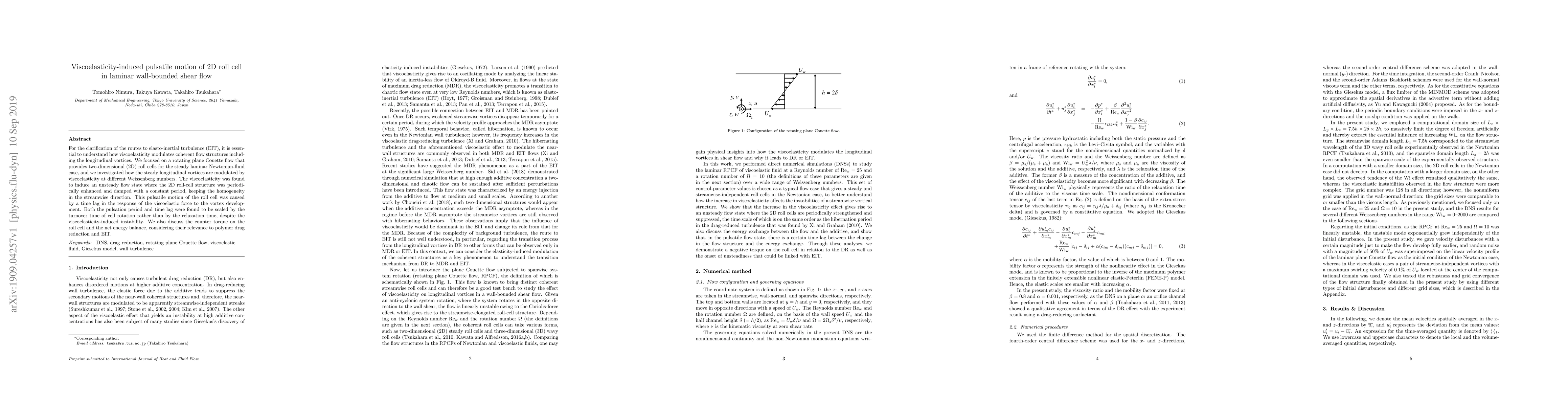 This study investigates how viscoelasticity induces pulsatile motion in 2D roll cells in a laminar wall-bounded shear flow, revealing that viscoelastic forces create periodic enhancements and damping of the flow structure. The pulsatile motion is driven by a time lag in viscoelastic response, scaling with the turnover time of cell rotation rather than relaxation time.