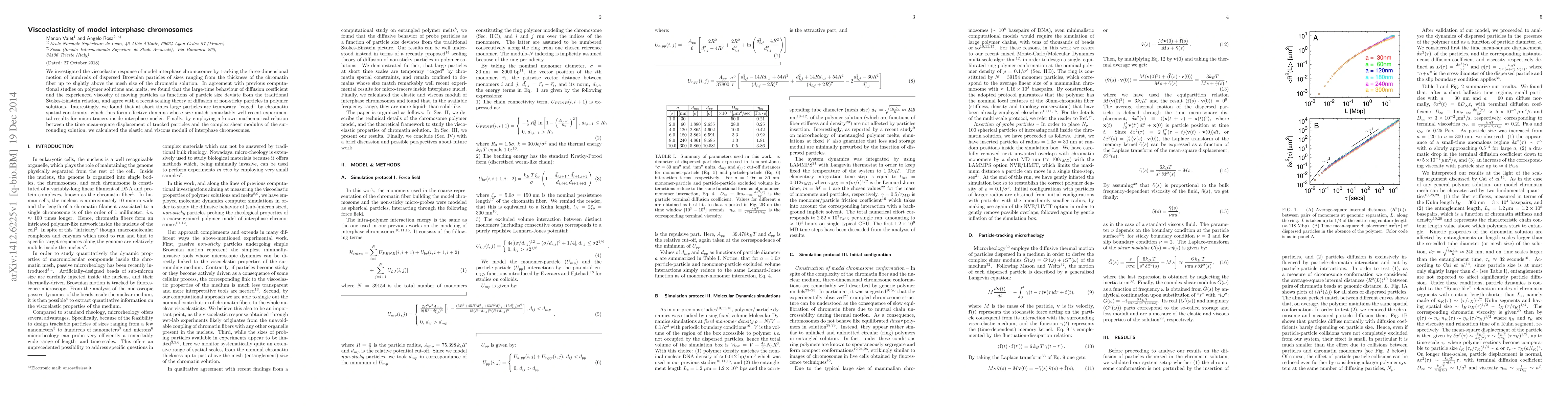 We investigated the viscoelastic response of model interphase chromosomes by tracking the three-dimensional motion of hundreds of dispersed Brownian particles of sizes ranging from the thickness of the chromatin fiber up to slightly above the mesh size of the chromatin solution. In agreement with previous computational studies on polymer solutions and melts, we found that the large-time behaviour of diffusion coefficient and the experienced viscosity of moving particles as functions of particle size deviate from the traditional Stokes-Einstein relation, and agree with a recent scaling theory of diffusion of non-sticky particles in polymer solutions. Interestingly, we found that at short times large particles are temporary "caged" by chromatin spatial constraints, which thus form effective domains whose size match remarkably well recent experimental results for micro-tracers inside interphase nuclei. Finally, by employing a known mathematical relation between the time mean-square displacement of tracked particles and the complex shear modulus of the surrounding solution, we calculated the elastic and viscous moduli of interphase chromosomes.