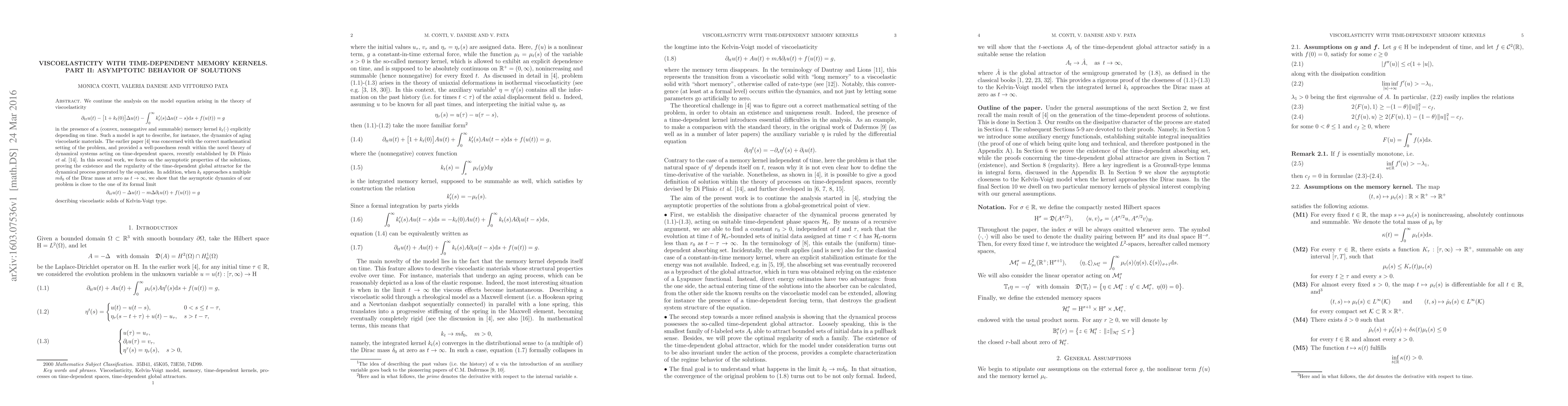 We continue the analysis on the model equation arising in the theory of viscoelasticity $$ \partial_{tt} u(t)-\big[1+k_t(0)\big]\Delta u(t) -\int_0^\infty k'_t(s)\Delta u(t-s) d s + f(u(t)) = g $$ in the presence of a (convex, nonnegative and summable) memory kernel $k_t(\cdot)$ explicitly depending on time. Such a model is apt to describe, for instance, the dynamics of aging viscoelastic materials. The earlier paper [4] was concerned with the correct mathematical setting of the problem, and provided a well-posedness result within the novel theory of dynamical systems acting on time-dependent spaces, recently established by Di Plinio {\it et al.}\ [14] In this second work, we focus on the asymptotic properties of the solutions, proving the existence and the regularity of the time-dependent global attractor for the dynamical process generated by the equation. In addition, when $k_t$ approaches a multiple $m\delta_0$ of the Dirac mass at zero as $t\to\infty$, we show that the asymptotic dynamics of our problem is close to the one of its formal limit $$\partial_{tt} u(t)-\Delta u(t) -m\Delta\partial_t u(t)+ f(u(t)) = g$$ describing viscoelastic solids of Kelvin-Voigt type.
