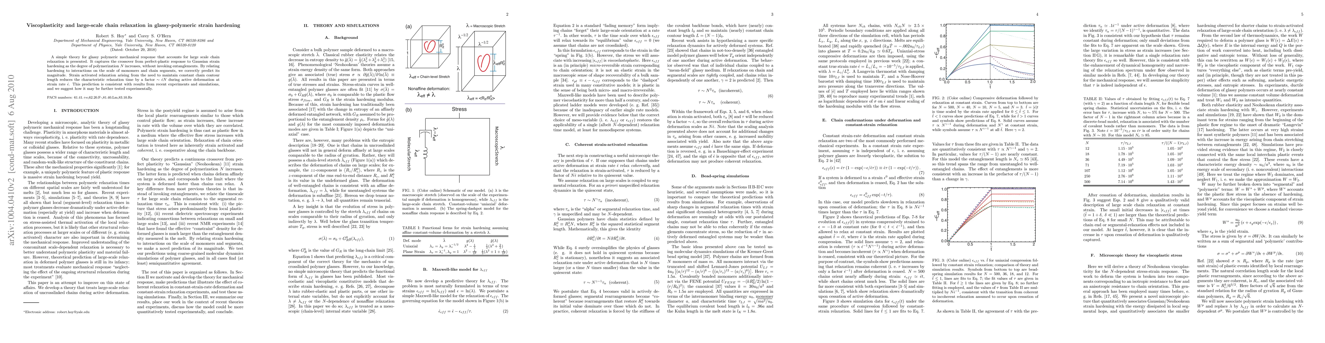 This paper presents a theory explaining the mechanical response of glassy polymers, focusing on the transition from perfect plasticity to strong strain hardening as polymerization degree increases. The model predicts the magnitude of strain hardening based on monomer and chain segment interactions, and suggests that strain-activated relaxation reduces the characteristic relaxation time during deformation.