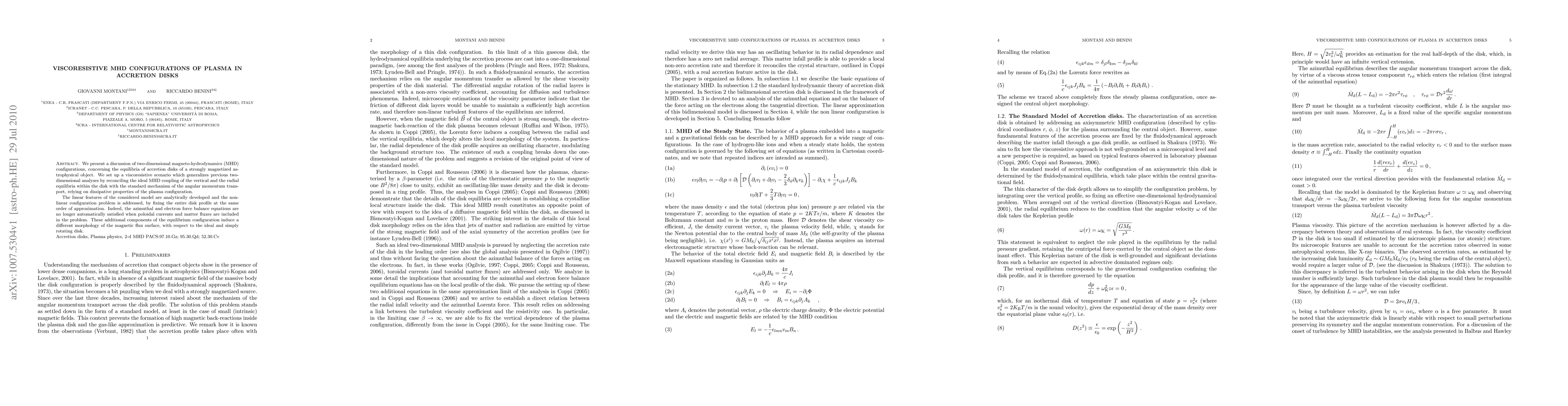 This paper explores two-dimensional magneto-hydrodynamics (MHD) configurations for accretion disks around strongly magnetized astrophysical objects, introducing a viscoresistive model that reconciles ideal MHD coupling with angular momentum transport. The study analytically develops linear features and addresses non-linear configurations, revealing a different magnetic flux surface morphology due to poloidal currents and matter fluxes.