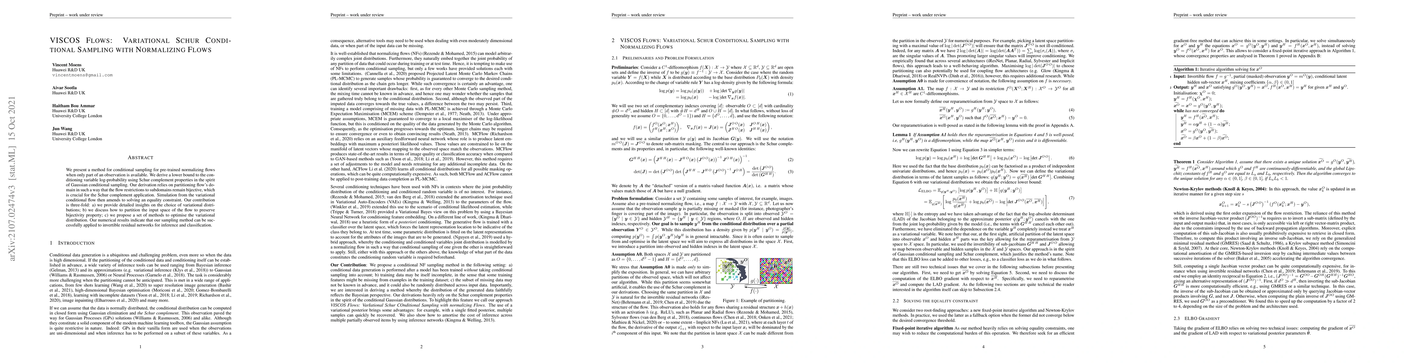 This paper introduces a method for conditional sampling using variational Schur conditional sampling with normalizing flows, focusing on scenarios where only part of an observation is available. It provides insights into variational distribution choices, input space partitioning for bijectivity, and optimization techniques, demonstrating successful application to inference and classification tasks.