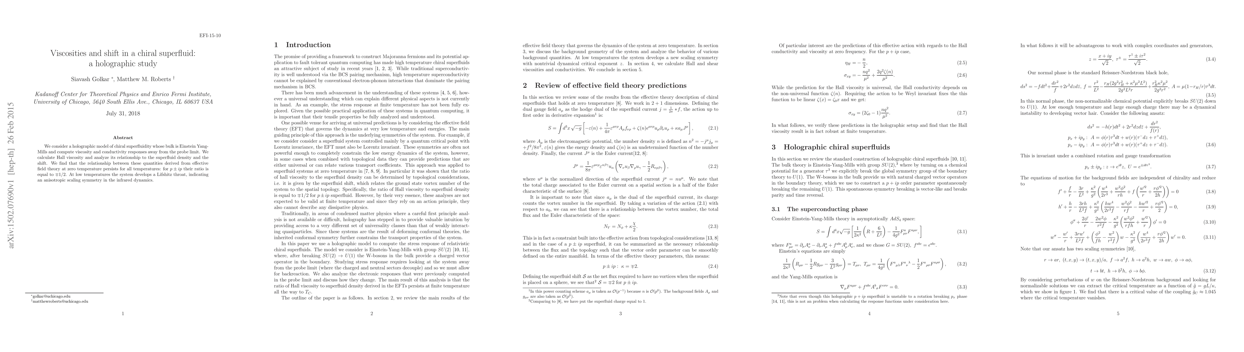We consider a holographic model of chiral superfluidity whose bulk is Einstein Yang-Mills and compute viscosity and conductivity responses away from the probe limit. We calculate Hall viscosity and analyze its relationship to the superfluid density and the shift. We find that the relationship between these quantities derived from effective field theory at zero temperature persists for all temperatures: for $p\pm ip$ their ratio is equal to $\mp1/2$. At low temperatures the system develops a Lifshitz throat, indicating an anisotropic scaling symmetry in the infrared dynamics.