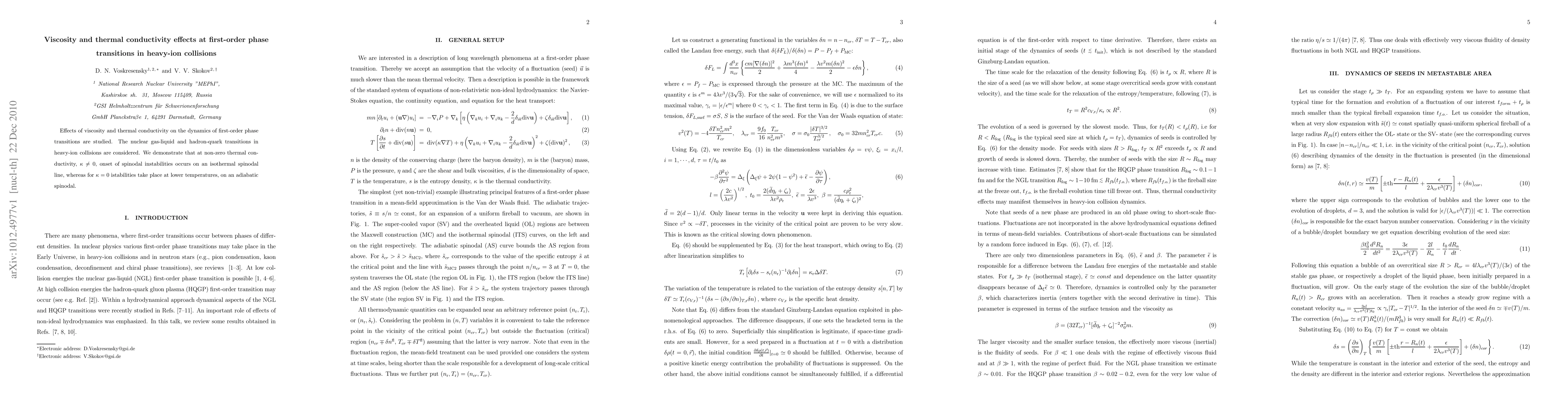 This paper investigates how viscosity and thermal conductivity influence the dynamics of first-order phase transitions in heavy-ion collisions, specifically nuclear gas-liquid and hadron-quark transitions. It finds that non-zero thermal conductivity leads to spinodal instabilities along an isothermal line, while zero thermal conductivity results in instabilities at lower temperatures on an adiabatic line.