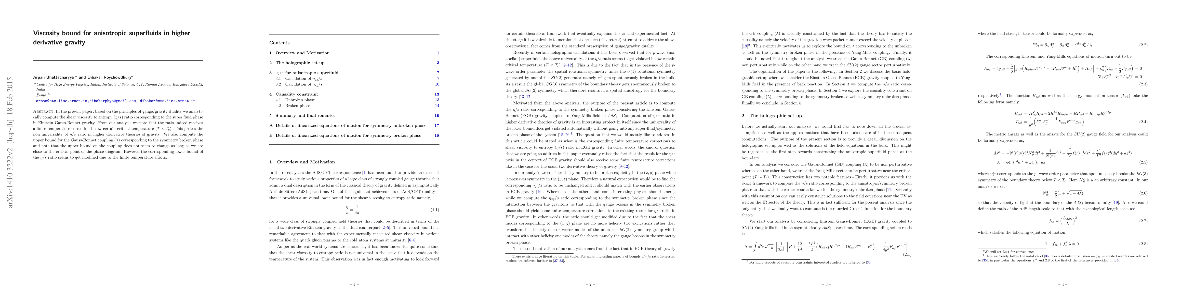 In the present paper, based on the principles of gauge/gravity duality we analytically compute the shear viscosity to entropy ratio corresponding to the superfluid phase in Einstein Gauss-Bonnet gravity. From our analysis we note that the ratio indeed receives a finite temperature correction below certain critical temperature. This proves the non universality of shear viscosity to entropy ratio in higher derivative theories of gravity. We also compute the upper bound for the Gauss-Bonnet coupling corresponding to the symmetry broken phase and note that the upper bound on the coupling does not seem to change as long as we are close to the critical point of the phase diagram. However the corresponding lower bound of the shear viscosity to entropy ratio seems to get modified due to the finite temperature effects.