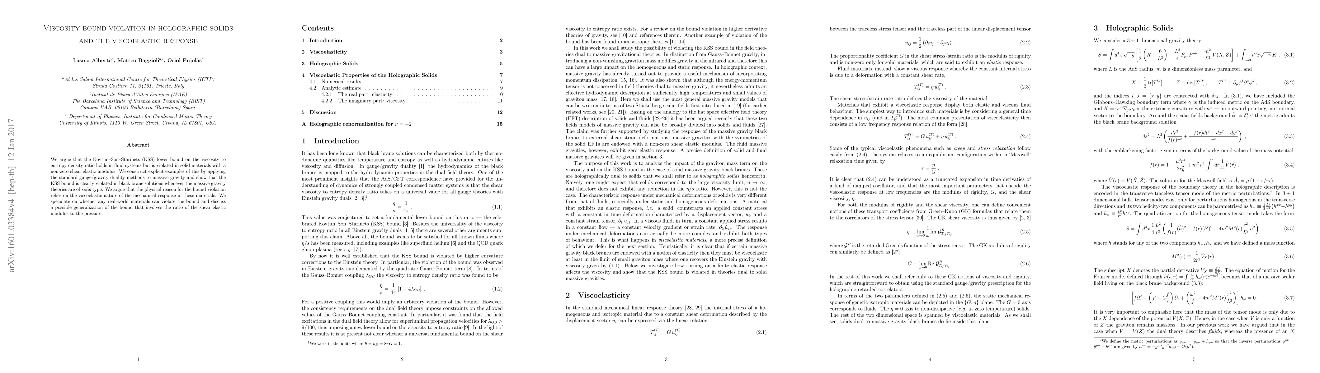 This paper demonstrates that the KSS lower bound on viscosity to entropy density ratio, valid for fluid systems, is violated in solid materials with non-zero shear elasticity, due to their viscoelastic mechanical response. The authors use gauge/gravity duality to show this violation in massive gravity theories of solid type.