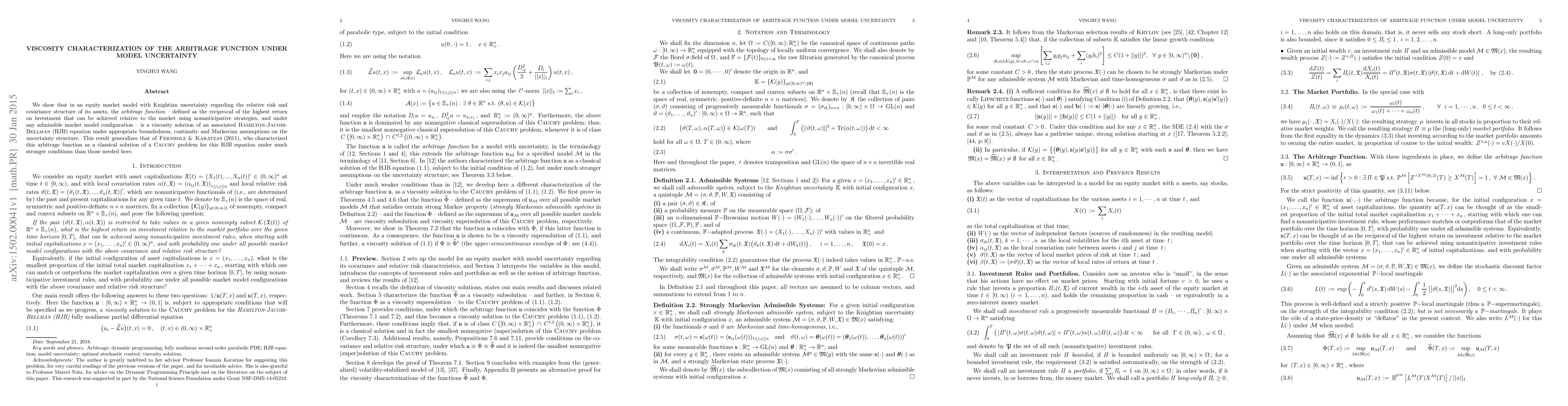 This paper demonstrates that the arbitrage function in an equity market model with Knightian uncertainty is a viscosity solution of a Hamilton-Jacobi-Bellman equation, under boundedness, continuity, and Markovian assumptions. This generalizes prior work by Fernholz and Karatzas, which required stronger conditions.