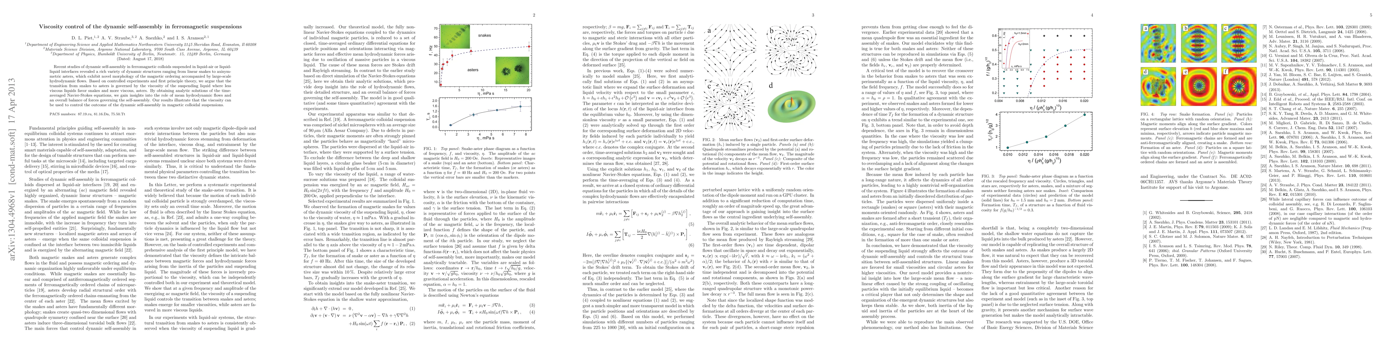 This study reveals how the viscosity of the suspending liquid influences the dynamic self-assembly of ferromagnetic colloids, demonstrating that lower viscosity favors snake-like structures while higher viscosity promotes axisymmetric asters. Analytic solutions of the Navier-Stokes equations provide insights into the hydrodynamic forces and balance governing these transitions.
