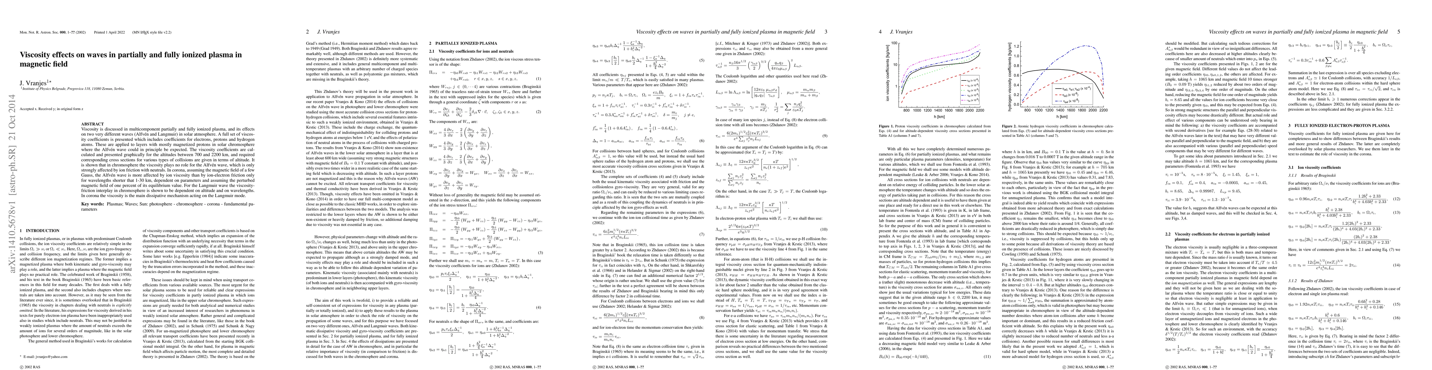 Viscosity is discussed in multicomponent partially and fully ionized plasma, and its effects on two very different waves (Alfven and Langmuir) in solar atmosphere. A full set of viscosity coefficients is presented which includes coefficients for electrons, protons and hydrogen atoms. These are applied to layers with mostly magnetized protons in solar chromosphere where the Alfven wave could in principle be expected. The viscosity coefficients are calculated and presented graphically for the altitudes between 700 and 2200 km, and required corresponding cross sections for various types of collisions are given in terms of altitude. It is shown that in chromosphere the viscosity plays no role for the Alfven wave, which is only strongly affected by ion friction with neutrals. In corona, assuming the magnetic field of a few Gauss, the Alfven wave is more affected by ion viscosity than by ion-electron friction only for wavelengths shorter that 1-30 km, dependent on parameters and assuming the perturbed magnetic field of one percent of its equilibrium value. For the Langmuir wave the viscosity-friction interplay in chromosphere is shown to be dependent on altitude and on wavelengths. In corona the viscosity is the main dissipative mechanism acting on the Langmuir mode.
