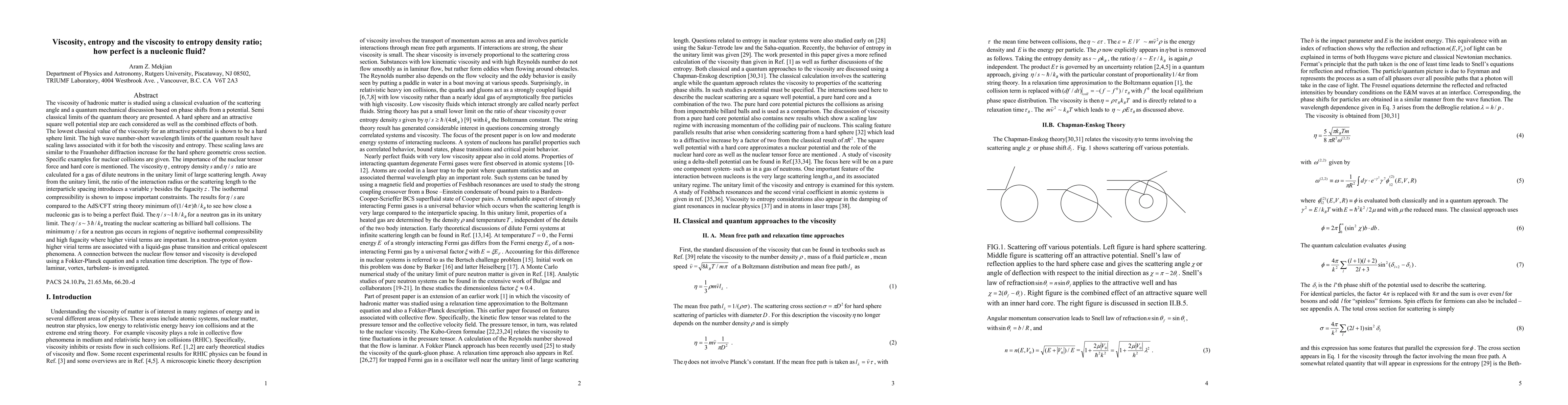 The viscosity of hadronic matter is studied using a classical evaluation of the scattering angle and a quantum mechanical discussion based on phase shifts from a potential. Semi classical limits of the quantum theory are presented. A hard sphere and an attractive square well potential step are each considered as well as the combined effects of both. The lowest classical value of the viscosity for an attractive potential is shown to be a hard sphere limit. The high wave number-short wavelength limits of the quantum result have scaling laws associated with it for both the viscosity and entropy. These scaling laws are similar to the Fraunhoher diffraction increase for the hard sphere geometric cross section. Specific examples for nuclear collisions are given. The importance of the nuclear tensor force and hard core is mentioned. The viscosity (eta), entropy density (s) and eta/s ratio are calculated for a gas of dilute neutrons in the unitary limit of large scattering length. Away from the unitary limit, the ratio of the interaction radius or the scattering length to the interparticle spacing introduces a variable y besides the fugacity z. The isothermal compressibility is shown to impose important constraints. The results for eta/s are compared to the AdS/CFT string theory minimum of (1/4Pi)hbar/kb to see how close a nucleonic gas is to being a perfect fluid. The eta/s ~1hbar/kb for a neutron gas in its unitary limit. The eta/s 3hbar/kb treating the nuclear scattering as billiard ball collisions. The minimum eta/s for a neutron gas occurs in regions of negative isothermal compressibility and high fugacity where higher virial terms are important. In a neutron-proton system higher virial terms are associated with a liquid-gas phase transition and critical opalescent phenomena.The type of flow-laminar,vortex, turbulent- is investigated.