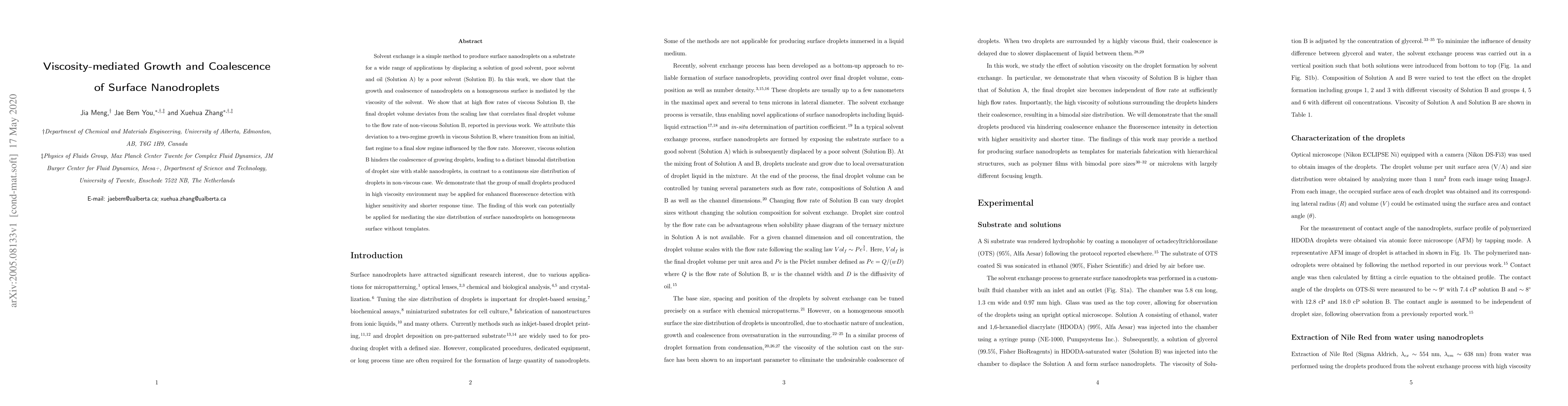 This paper investigates how the viscosity of a solvent influences the growth and coalescence of surface nanodroplets during solvent exchange. It finds that high viscosity solvents lead to a bimodal droplet size distribution and hinder coalescence, enabling enhanced fluorescence detection.