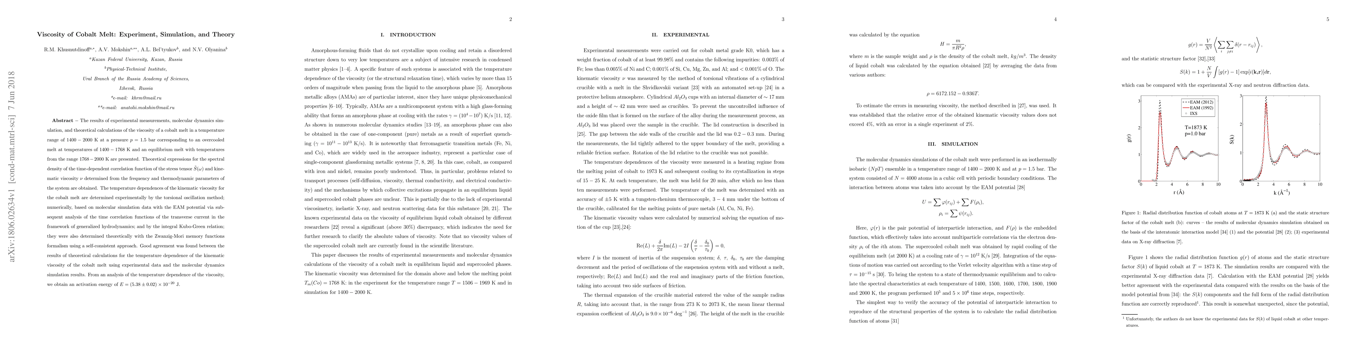 Researchers studied the viscosity of cobalt melt using experimental measurements, simulations, and theory, finding a temperature-dependent relationship with an activation energy of $E=(5.38 m{~J})$.