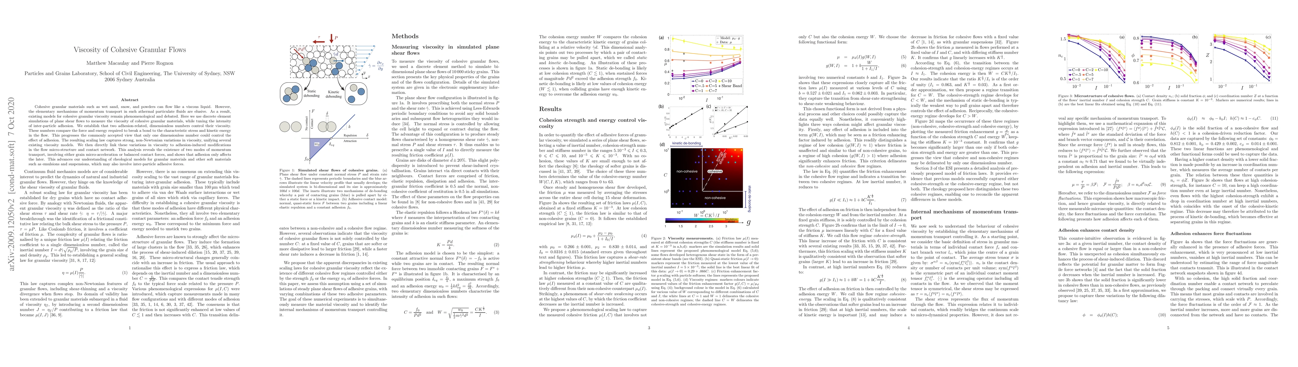 This paper uses discrete element simulations to study the viscosity of cohesive granular flows, identifying two adhesion-related dimensionless numbers that control viscosity. It reveals two modes of momentum transport and advances understanding of rheological models for granular and similar soft materials.