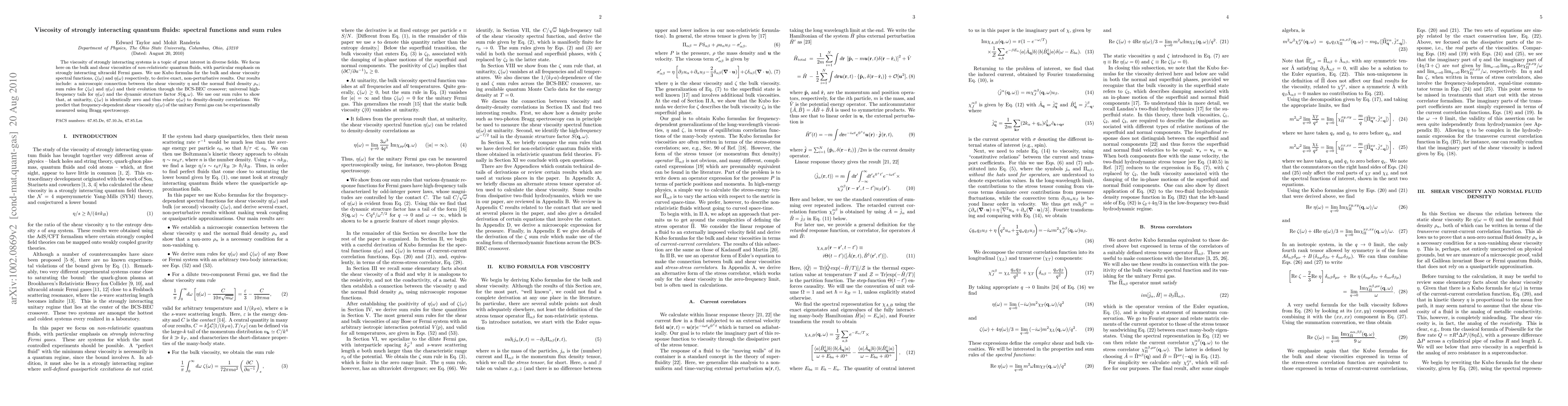 This paper investigates the bulk and shear viscosities of non-relativistic quantum fluids, particularly ultracold Fermi gases, using Kubo formulas. It establishes a microscopic connection between shear viscosity and normal fluid density, and predicts frequency-dependent shear viscosity measurable via Bragg spectroscopy.