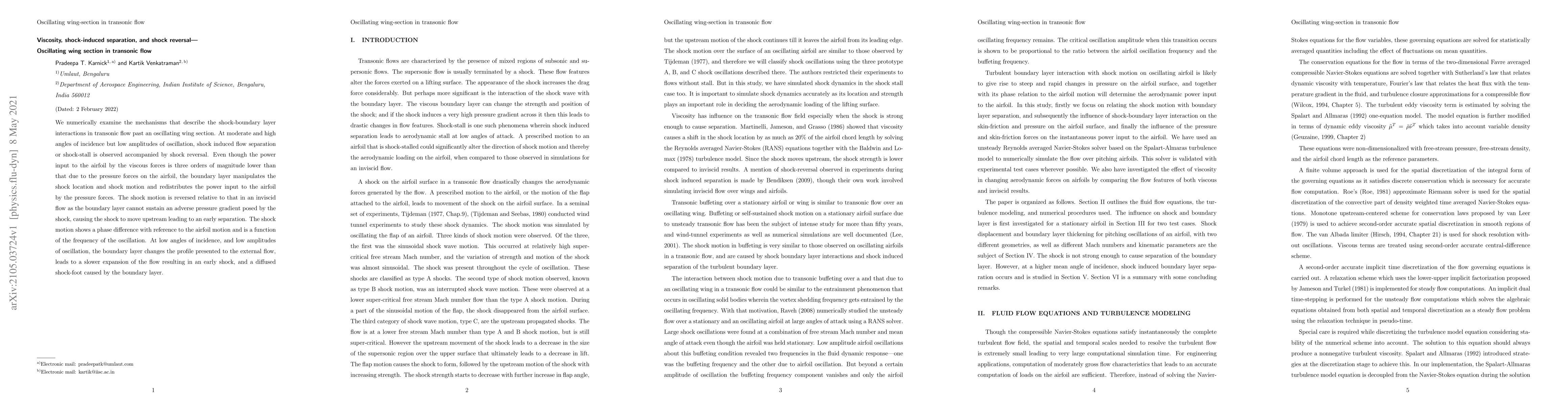 This research uses numerical methods to study how oscillating wing sections interact with transonic flow, revealing that even low-amplitude oscillations can cause shock-induced separation or 'shock-stall' due to viscous boundary layer effects. The study finds that the boundary layer, despite its lower power input, significantly influences shock location and motion, leading to shock reversal and altered airfoil performance.