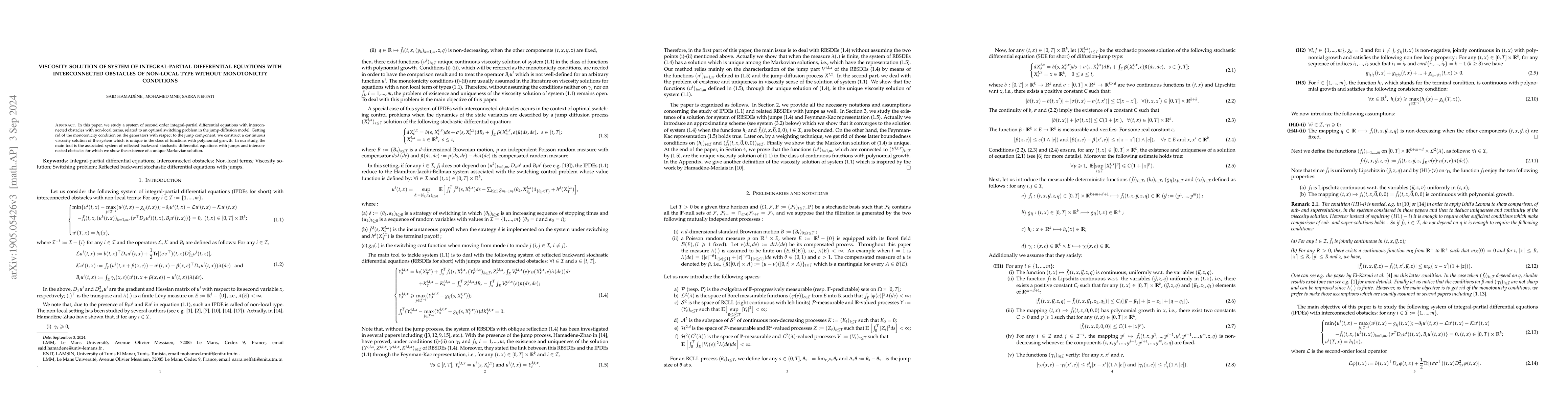 In this paper, we study a system of second order integro-partial differential equations with interconnected obstacles with non-local terms, related to an optimal switching problem with the jump-diffusion model. Getting rid of the monotonicity condition on the generators with respect to the jump component, we construct a continuous viscosity solution which is unique in the class of functions with polynomial growth. In our study, the main tool is the notion of reflected backward stochastic differential equations with jumps with interconnected obstacles for which we show the existence of a solution.