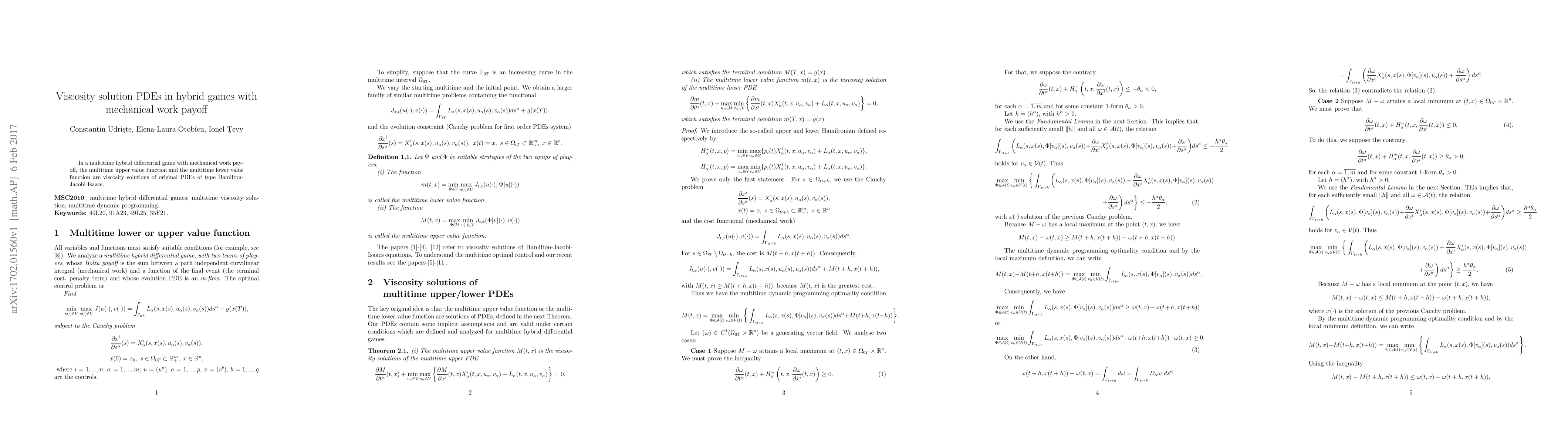 In a multitime hybrid differential game with mechanical work payoff, the multitime upper value function and the multitime lower value function are viscosity solutions of original PDEs of type Hamilton-Jacobi-Isaacs.