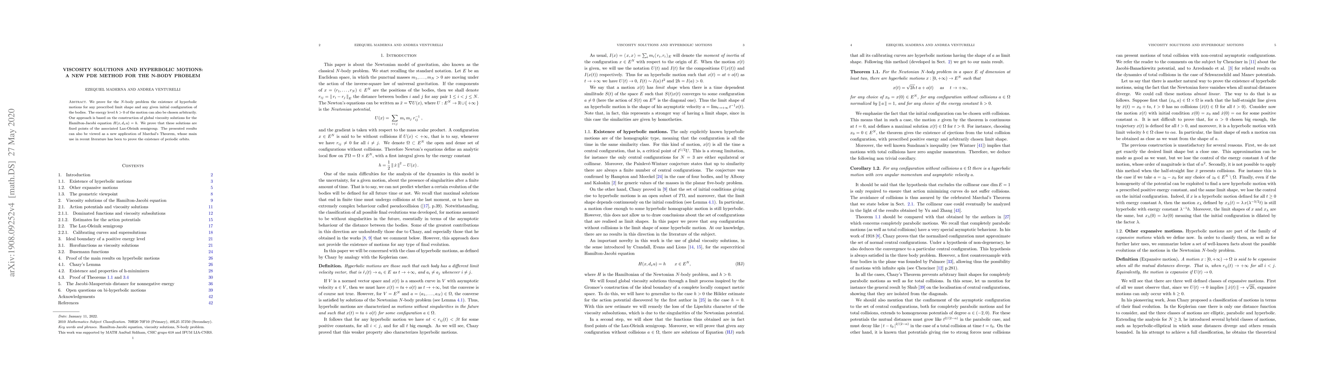 We prove for the $N$-body problem the existence of hyperbolic motions for any prescribed limit shape and any given initial configuration of the bodies. The energy level $h>0$ of the motion can also be chosen arbitrarily. Our approach is based on the construction of global viscosity solutions for the Hamilton-Jacobi equation $H(x,d_xu)=h$. We prove that these solutions are fixed points of the associated Lax-Oleinik semigroup. The presented results can also be viewed as a new application of Marchal's theorem, whose main use in recent literature has been to prove the existence of periodic orbits.