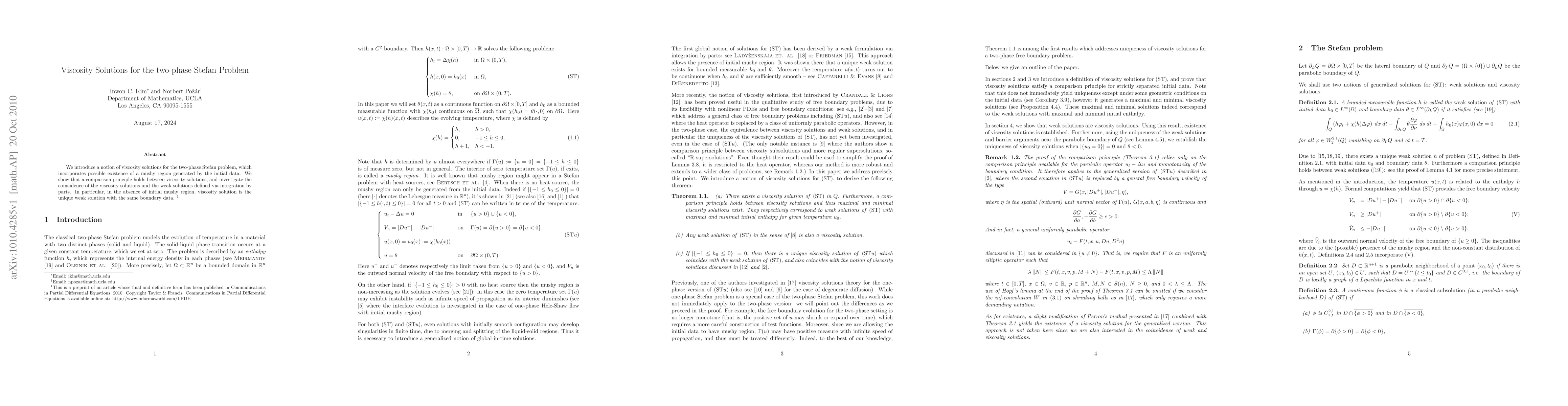 This paper introduces viscosity solutions for the two-phase Stefan problem, addressing the potential existence of a mushy region. It establishes a comparison principle for viscosity solutions and demonstrates their equivalence to weak solutions in the absence of an initial mushy region.