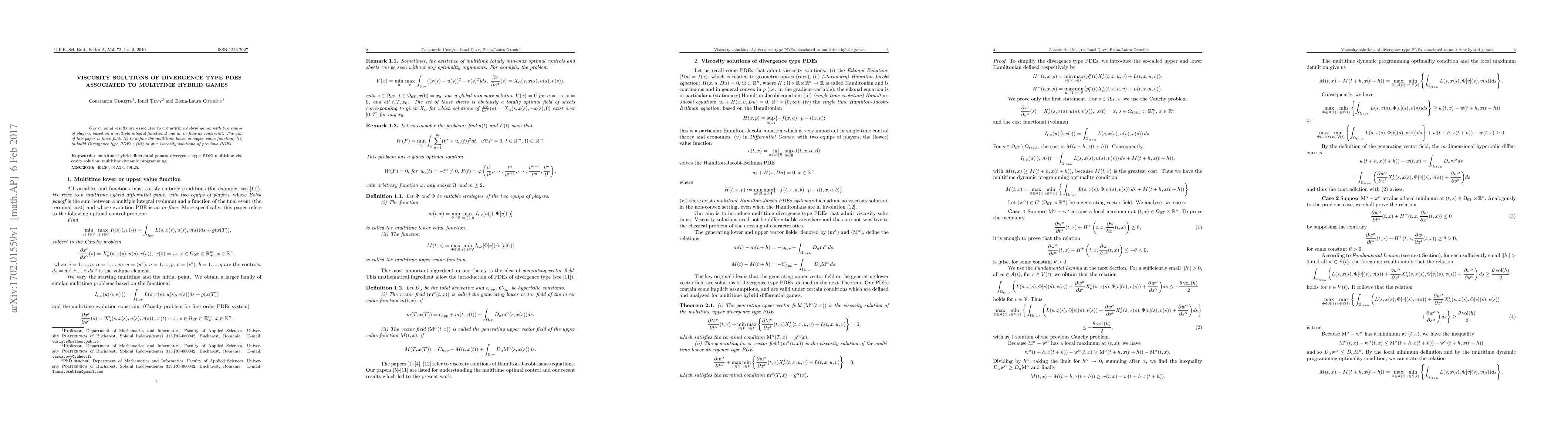 This paper defines the multitime lower and upper value functions for a hybrid game involving two teams, constructs divergence type partial differential equations (PDEs), and provides viscosity solutions for these PDEs.