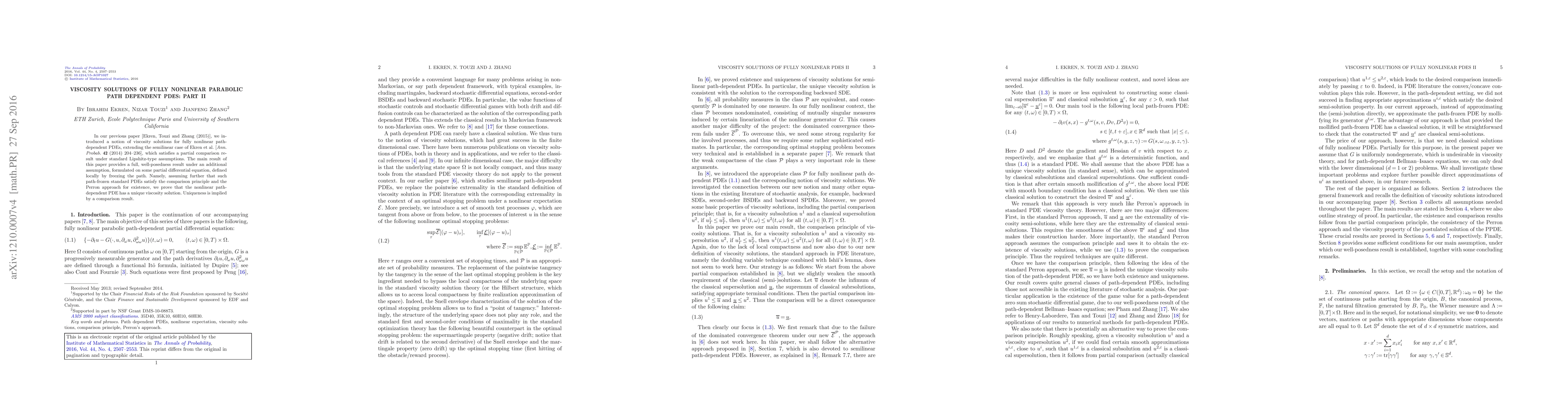 This paper extends the notion of viscosity solutions for fully nonlinear path-dependent PDEs, proving uniqueness under additional assumptions. It builds on prior work, establishing a comparison principle and existence via the Perron method for path-frozen standard PDEs to ensure the nonlinear PDE has a unique viscosity solution.