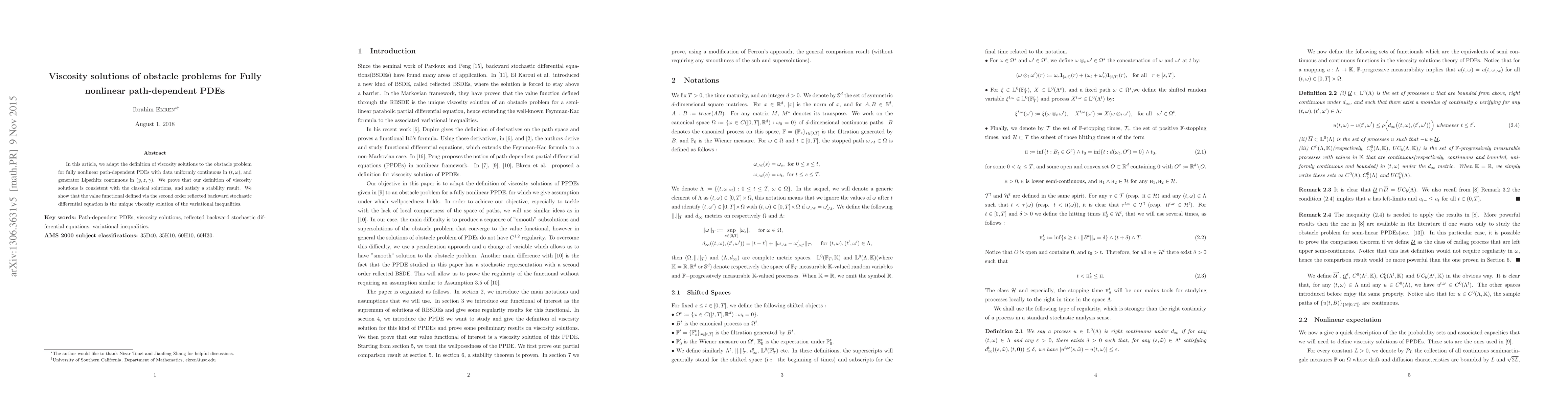 This paper introduces a definition of viscosity solutions for obstacle problems in fully nonlinear path-dependent PDEs, proving consistency with classical solutions and stability. It demonstrates that the value functional derived from reflected backward stochastic differential equations uniquely satisfies the variational inequalities as a viscosity solution.