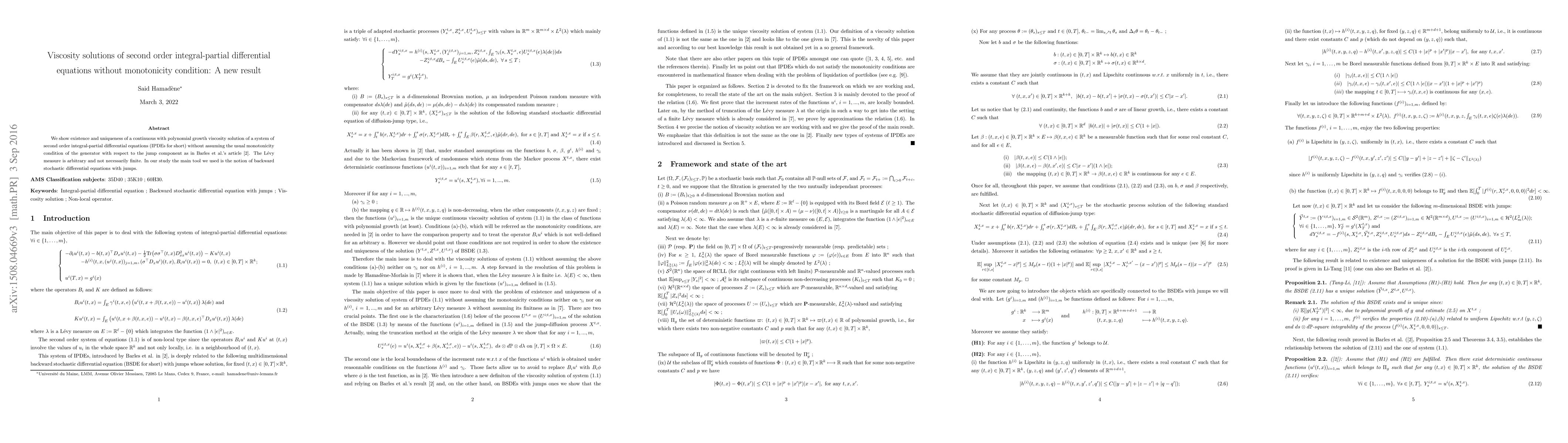 This paper establishes the existence and uniqueness of a continuous, polynomially growing viscosity solution for a system of second-order integral-partial differential equations (IPDEs) without relying on the typical monotonicity condition. The authors utilize backward stochastic differential equations with jumps as their primary analytical tool.