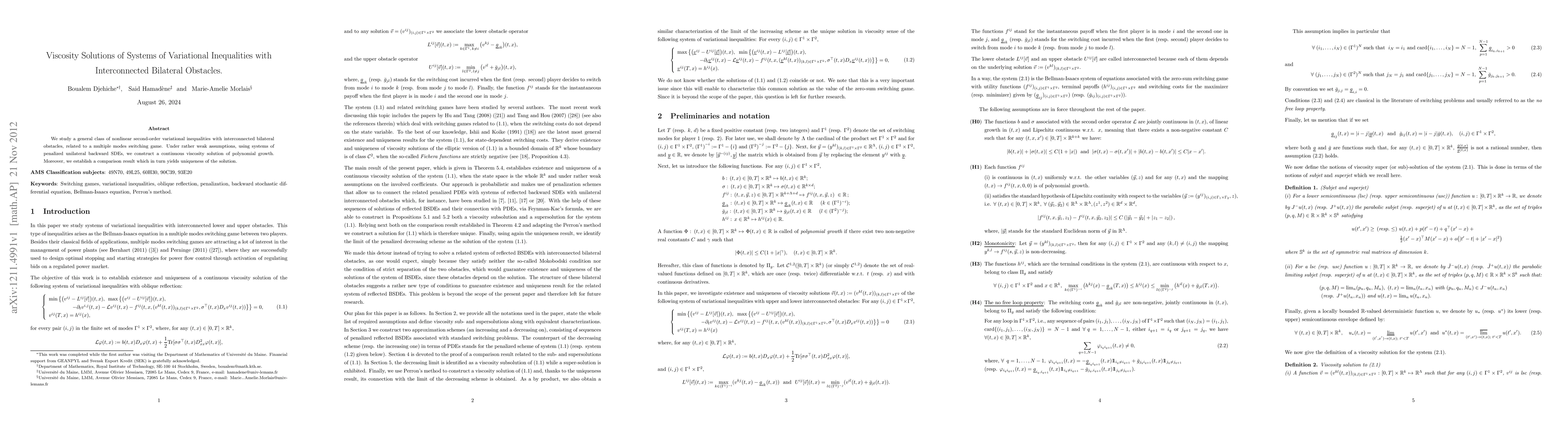 This paper constructs a continuous viscosity solution of polynomial growth for a class of nonlinear second-order variational inequalities with interconnected bilateral obstacles, related to a multiple modes switching game, and proves uniqueness via a comparison result.