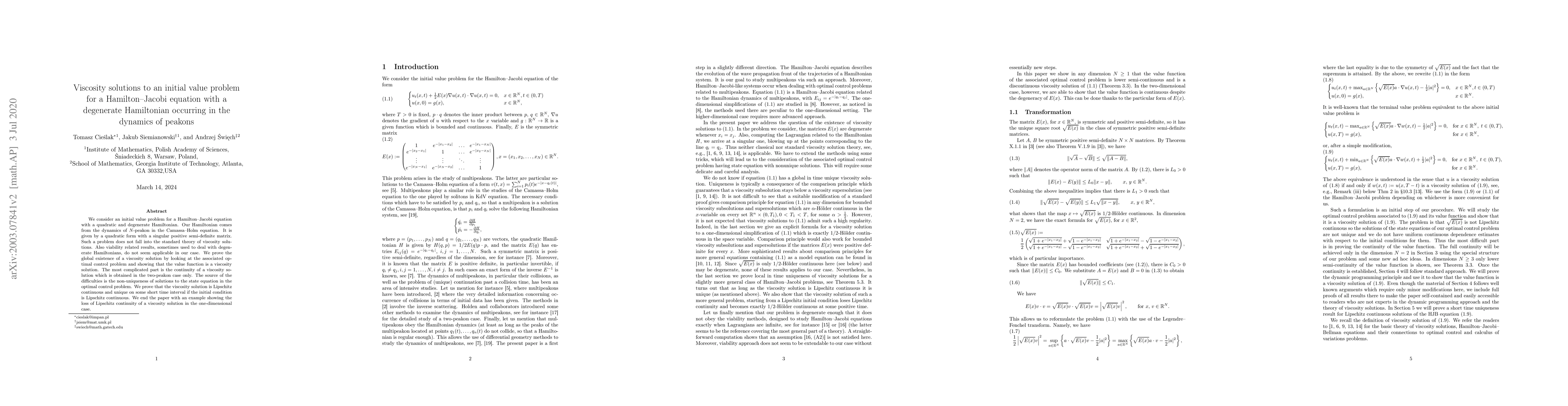 We consider an initial value problem for a Hamilton--Jacobi equation with a quadratic and degenerate Hamiltonian. Our Hamiltonian comes from the dynamics of $N$-peakon in the Camassa--Holm equation. It is given by a quadratic form with a singular positive semi-definite matrix. Such a problem does not fall into the standard theory of viscosity solutions. Also viability related results, sometimes used to deal with degenerate Hamiltonians, do not seem applicable in our case. We prove the global existence of a viscosity solution by looking at the associated optimal control problem and showing that the value function is a viscosity solution. The most complicated part is the continuity of a viscosity solution which is obtained in the two-peakon case only. The source of the difficulties is the non-uniqueness of solutions to the state equation in the optimal control problem. We prove that the viscosity solution is Lipschitz continuous and unique on some short time interval if the initial condition is Lipschitz continuous. We end the paper with an example showing the loss of Lipschitz continuity of a viscosity solution in the one-dimensional case.
