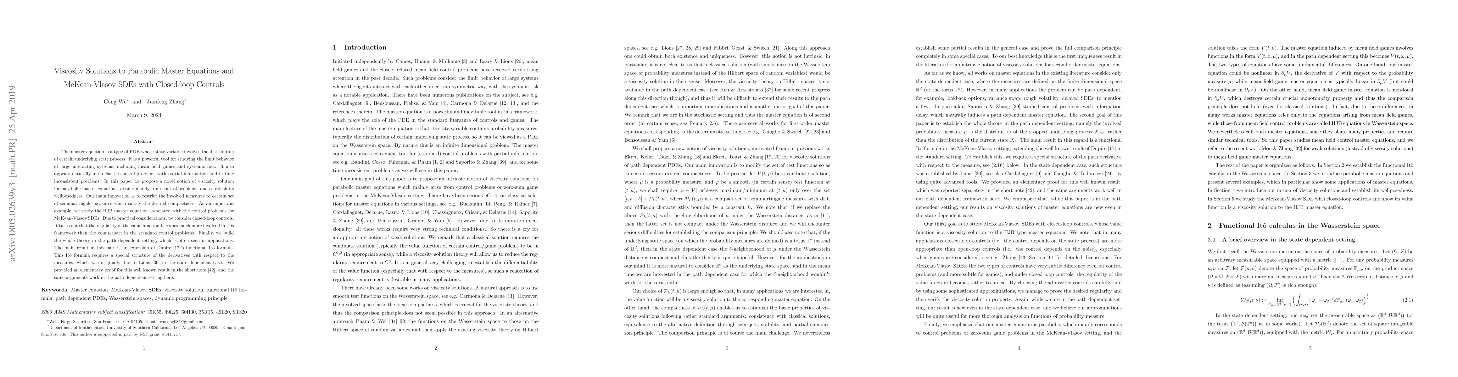 The master equation is a type of PDE whose state variable involves the distribution of certain underlying state process. It is a powerful tool for studying the limit behavior of large interacting systems, including mean field games and systemic risk. It also appears naturally in stochastic control problems with partial information and in time inconsistent problems. In this paper we propose a novel notion of viscosity solution for parabolic master equations, arising mainly from control problems, and establish its wellposedness. Our main innovation is to restrict the involved measures to certain set of semimartingale measures which satisfy the desired compactness. As an important example, we study the HJB master equation associated with the control problems for McKean-Vlasov SDEs. Due to practical considerations, we consider closed-loop controls. It turns out that the regularity of the value function becomes much more involved in this framework than the counterpart in the standard control problems. Finally, we build the whole theory in the path dependent setting, which is often seen in applications. The main result in this part is an extension of Dupire \cite{Dupire}'s functional It\^{o} formula. This It\^{o} formula requires a special structure of the derivatives with respect to the measures, which was originally due to Lions \cite{Lions4} in the state dependent case. We provided an elementary proof for this well known result in the short note \cite{WZ}, and the same arguments work in the path dependent setting here.