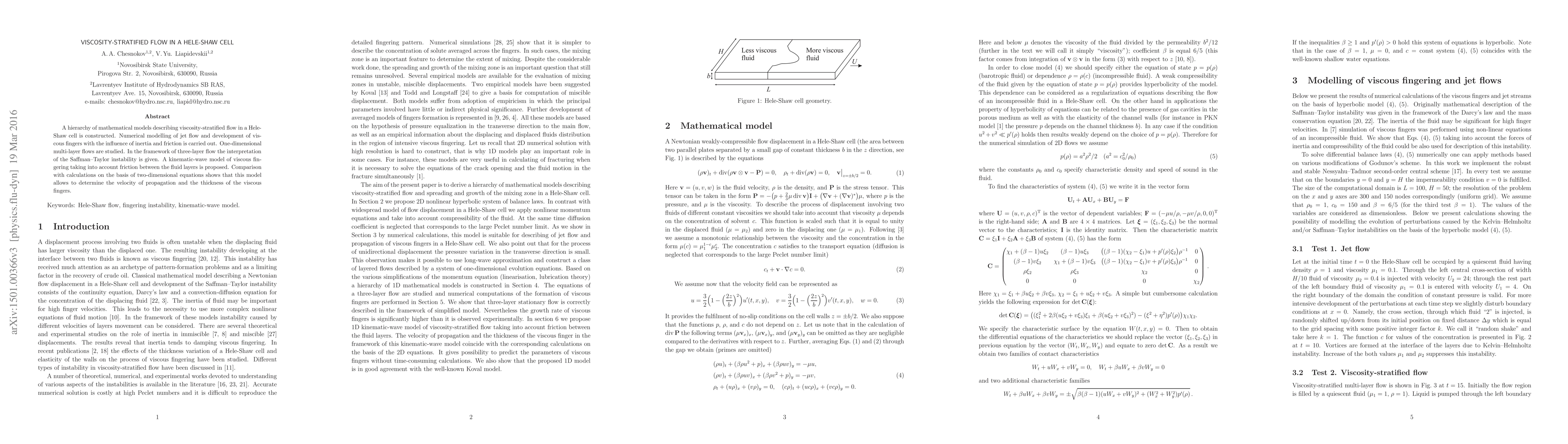 A hierarchy of mathematical models describing viscosity-stratified flow in a Hele-Shaw cell is constructed. Numerical modelling of jet flow and development of viscous fingers with the influence of inertia and friction is carried out. One-dimensional multi-layer flows are studied. In the framework of three-layer flow the interpretation of the Saffman--Taylor instability is given. A kinematic-wave model of viscous fingering taking into account friction between the fluid layers is proposed. Comparison with calculations on the basis of two-dimensional equations shows that this model allows to determine the velocity of propagation and the thickness of the viscous fingers.