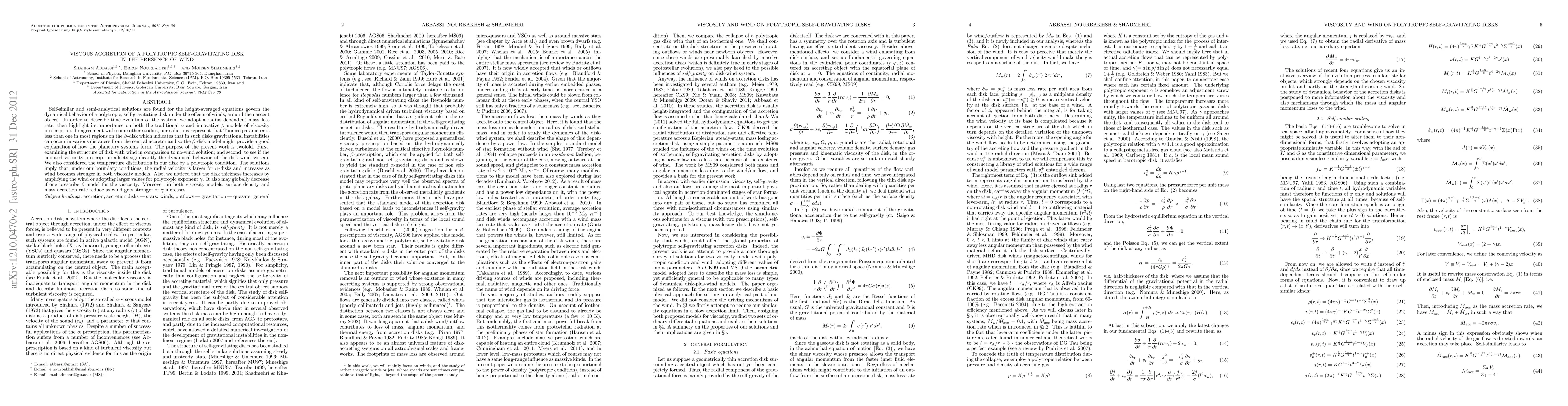 This paper presents self-similar solutions for a polytropic, self-gravitating disk influenced by wind, comparing traditional $\alpha$ and innovative $\beta$ viscosity models. The study finds that stronger winds and higher polytropic exponents lead to increased disk thickness and reduced radial velocity, suggesting that the $\beta$-model may better explain planetary system formation.