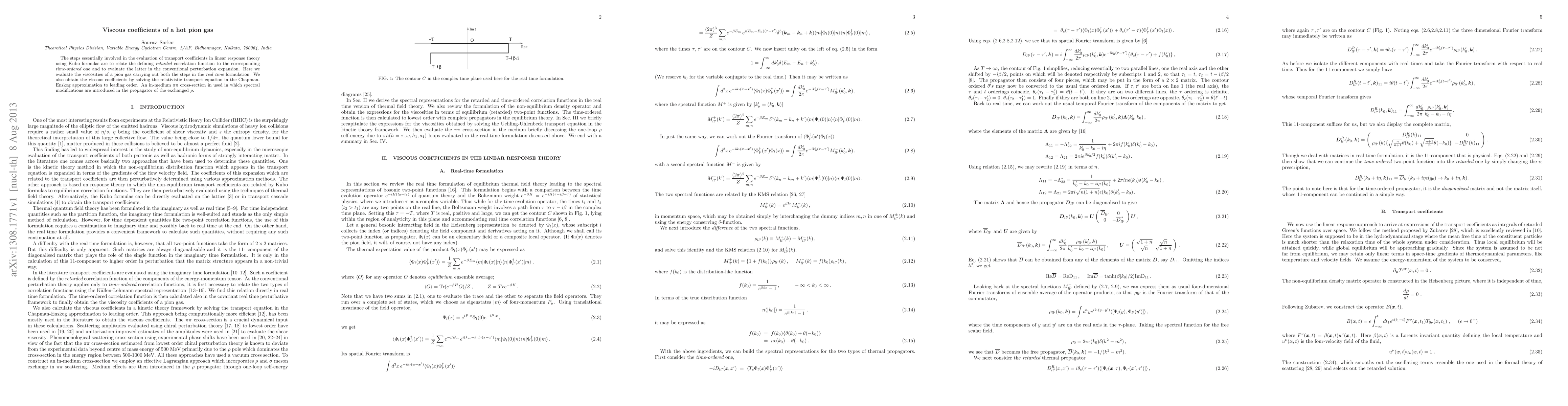 The steps essentially involved in the evaluation of transport coefficients in linear response theory using Kubo formulas are to relate the defining {\em retarded} correlation function to the corresponding {\em time-ordered} one and to evaluate the latter in the conventional perturbation expansion. Here we evaluate the viscosities of a pion gas carrying out both the steps in the {\em real time} formulation. We also obtain the viscous coefficients by solving the relativistic transport equation in the Chapman-Enskog approximation to leading order. An in-medium $\pi\pi$ cross-section in used in which spectral modifications are introduced in the propagator of the exchanged $\rho$.