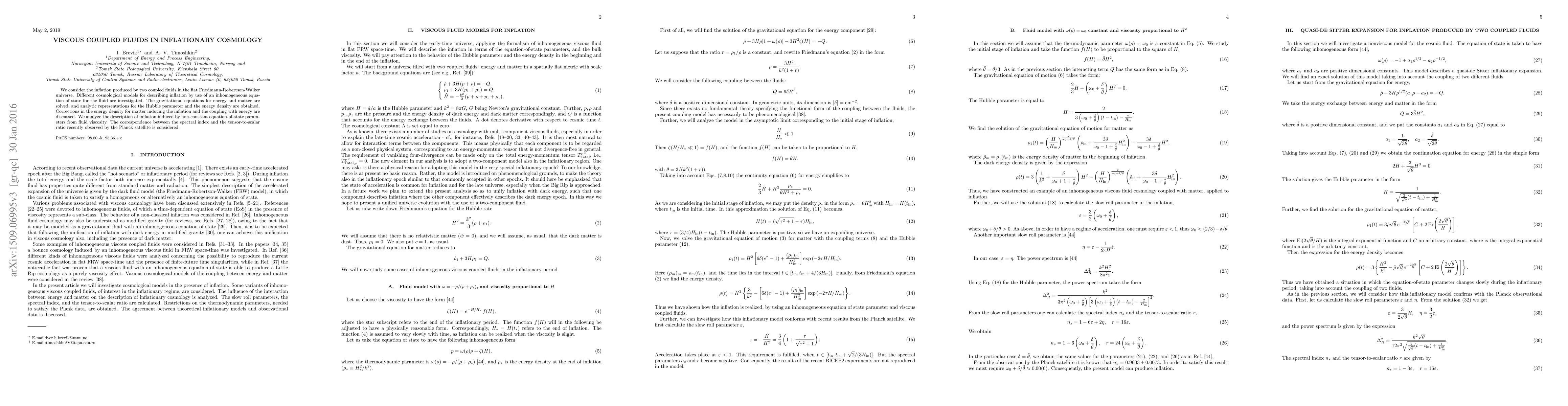 We consider the inflation produced by two coupled fluids in the flat Friedmann-Robertson-Walker universe. Different cosmological models for describing inflation by use of an inhomogeneous equation of state for the fluid are investigated. The gravitational equations for energy and matter are solved, and analytic representations for the Hubble parameter and the energy density are obtained. Corrections in the energy density for matter inducing the inflation and the coupling with energy are discussed. We analyze the description of inflation induced by non-constant equation-of-state parameters from fluid viscosity. The correspondence between the spectral index and the tensor-to-scalar ratio recently observed by the Planck satellite is considered.