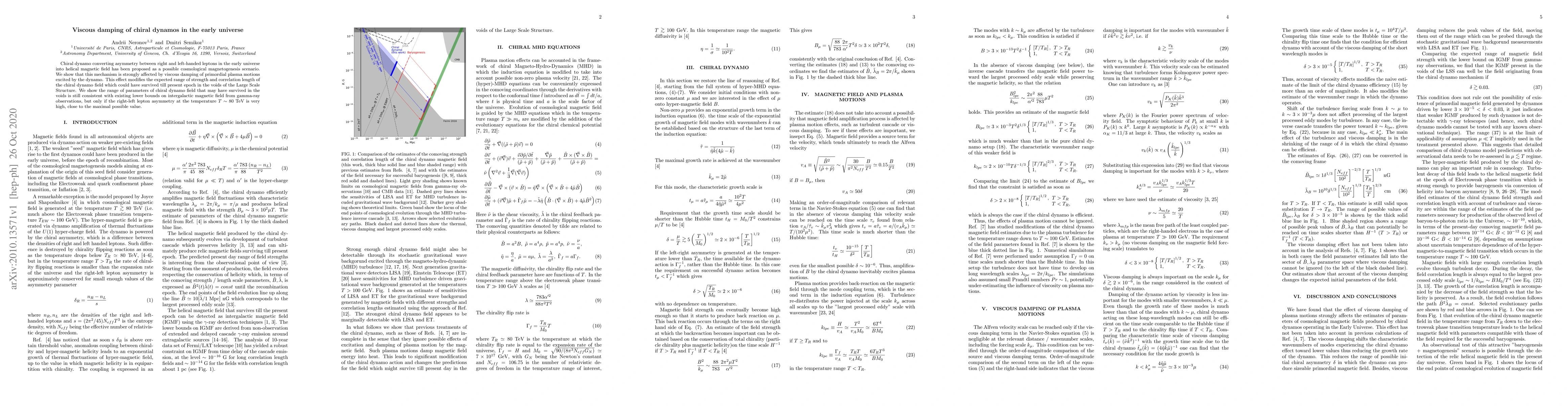 Chiral dynamo converting asymmetry between right and left-handed leptons in the early universe into helical magnetic field has been proposed as a possible cosmological magnetogenesis scenario. We show that this mechanism is strongly affected by viscous damping of primordial plasma motions excited by the dynamo. This effect modifies the expected range of strength and correlation length of the chiral dynamo field which could have survived till present epoch in the voids of the Large Scale Structure. We show the range of parameters of chiral dynamo field that may have survived in the voids is still consistent with existing lower bounds on intergalactic magnetic field from gamma-ray observations, but only if the right-left lepton asymmetry at the temperature T~80 TeV is very high, close to the maximal possible value.